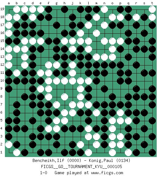 Last move : 1-0 2010 September 6 0:8:28 [Event "FICGS__GO__TOURNAMENT_KYU__000105"] [Site "FICGS"] [Date "2010.06.09"] [Round "1"] [Black "Bencheikh,Ilf"] [White "Konig,Paul"] [Result "1-0"] [Rating 1 "0000"] [Rating 2 "0134"] 1.q3 k10 2.e3 f6 3.q15 n13 4.e16 o15 5.p17 n17 6.k17 m16 7.c4 c6 8.q10 p18 9.q18 o18 10.g17 l14 11.k4 g4 12.c11 p15 13.q16 q14 14.r14 r13 15.q13 q12 16.p14 o14 17.r12 s13 18.p12 n8 19.q6 r11 20.q11 r10 21.r9 t10 22.c8 e9 23.g3 q9 24.q8 p9 25.r8 p8 26.h4 g5 27.n4 k16 28.j16 j15 29.h16 h15 30.d14 h5 31.j4 g16 32.g15 f16 33.f15 f17 34.f18 e17 35.d17 h13 36.n6 e15 37.e18 d15 38.e14 c15 39.d16 c14 40.c16 c13 41.d13 c12 42.d12 b11 43.c10 a12 44.b15 b14 45.b16 a14 46.b10 a10 47.a9 d10 48.d11 e11 49.d9 f10 50.e10 f11 51.d10 f9 52.k6 k18 53.j18 l17 54.j17 l19 55.b6 c7 56.b7 d8 57.d7 d6 58.e8 e7 59.d8 e5 60.f7 f8 61.e6 c5 62.e7 f4 63.f3 d4 64.d3 c3 65.b4 b3 66.b5 a4 67.a5 a2 68.a3 c2 69.a4 e1 70.d2 d1 71.d5 e2 72.e4 f2 73.g2 g1 74.h1 j1 75.f1 b1 76.c1 d1 77.e1 k2 78.c1 s9 79.b2 t8 80.s8 s7 81.s6 r7 82.q7 t6 83.s11 s10 84.t11 s12 85.t9 r6 86.t7 s5 87.t8 t4 88.r5 q5 89.s6 r4 90.r6 p5 91.t5 s3 92.s4 t2 93.t3 r2 94.r3 s1 95.q4 o5 96.o6 p6 97.p7 o4 98.n5 o3 99.n3 o2 100.n2 p2 101.s2 q1 102.t1 l1 103.j2 o7 104.r1 o1 105.q2 m2 106.k1 l3 107.j1 m3 108.m4 l4 109.l5 m6 110.m7 l7 111.l6 m8 112.n7 o9 113.g6 g7 114.f5 h6 115.f6 j7 116.n12 o13 117.o12 m13 118.m12 l12 119.g13 g12 120.g14 f12 121.h14 j14 122.l11 m11 123.m10 l10 124.n11 j10 125.k12 k13 126.l13 l15 127.l12 m18 128.h12 j12 129.j13 j11 130.k14 k15 131.k13 n15 132.o8 n10 133.o7 m9 134.m11 o10 135.p10 o11 136.l8 k7 137.l9 k9 138.n9 k8 139.p11 j6 140.h11 h10 141.g11 g10 142.h13 h8 143.o17 n19 144.p19 p3 145.q19 j19 146.h19 b18 147.k19 c19 148.l18 a17 149.m19 d19 150.l19 d18 151.a19 a18 152.b17 c17 153.c18 b19 154.c17 e19 155.f19 a16 156.a15 a13 157.a11 t14 158.a10 t12 159.s14 s15 160.t13 t16 161.t15 s17 162.t14 r16 163.r15 r18 164.s16 q17 165.r17 t19 166.t17 t18 167.s18 1-0 Here are the names of the openings (joseki) played in the four corners : Corner d4 : e3 f6 Mokuhazushi (Waemok, Wai`mu`) 5-3 Point. The mokuhazushi (5-3) point was popular in the Edo period in Japan (1600 - 1867). It emphasizes influence; territorially, it is inferior to the 3-4 point. Corner q16 : q15 n13 Takamoku (Gomok, Gaomu`) 5-4 Point. The takamoku (high) point (5-4). With its emphasis on influence, the 5-4 point complements the 4-4 (hoshi) point in creating an influence-oriented fuseki. Corner q4 : q3 n8 Komoku (Somok, Xiao~mu`) 3-4 Point. The komoku (3-4) point is the traditional corner enclosure move.. Player Black won this Go (weiqi, baduk) game. Follow this game move after move (download)To emphasize the lack of determination in his moves, one speaks of chance. (Pierre Audouard) The Internet is so big, so powerful and pointless that for some people it is a complete substitute for life. (Andrew Brown)