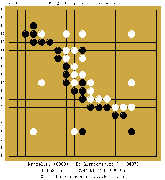 Last move : 0-1 2010 July 23 0:51:50 [Event "FICGS__GO__TOURNAMENT_KYU__000105"] [Site "FICGS"] [Date "2010.06.09"] [Round "1"] [Black "Marcel,Alexis"] [White "Di Giandomenico,Alfonso"] [Result "0-1"] [Rating 1 "0000"] [Rating 2 "0487"] 1.k10 q16 2.d16 k16 3.q4 q10 4.k4 e16 5.c16 k11 6.e15 d4 7.d15 e10 8.f15 j4 9.d17 j10 10.j9 l10 11.k9 l9 12.k8 l8 13.l7 n8 14.h10 j11 15.h11 j12 16.j13 k13 17.k14 j14 18.h12 h13 19.g13 h14 20.g14 h16 21.n7 o7 22.m7 m8 23.o6 p7 24.p6 q7 0-1 Here are the names of the openings (joseki) played in the four corners : Corner d16 : d16 e16 Hoshi (Hwajeom, Seongjeom, Xingwei`) 4-4 Point. The star or hoshi (4-4) point, emphasizing influence at the potential expense of territory. Corner q4 : q4 l9 Hoshi (Hwajeom, Seongjeom, Xingwei`) 4-4 Point. The star or hoshi (4-4) point, emphasizing influence at the potential expense of territory. Player White won this Go (weiqi, baduk) game. Follow this game move after move (download)There is death in the hane. (Anonymous) There are more things in heaven and earth than practically anywhere else. (Unknown)