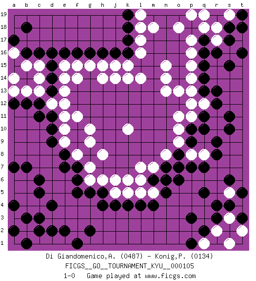 Last move : 1-0 2010 November 14 22:8:28 [Event "FICGS__GO__TOURNAMENT_KYU__000105"] [Site "FICGS"] [Date "2010.06.09"] [Round "1"] [Black "Di Giandomenico,Alfonso"] [White "Konig,Paul"] [Result "1-0"] [Rating 1 "0487"] [Rating 2 "0134"] 1.d4 k10 2.k4 k6 3.q5 o7 4.d10 g10 5.d16 f14 6.q15 o13 7.q10 o10 8.g5 h6 9.e7 f8 10.e8 e9 11.d9 e10 12.k16 k14 13.d14 e14 14.f16 c14 15.d15 e15 16.e16 c13 17.c12 d12 18.d11 e13 19.d13 e12 20.c11 c15 21.c16 b13 22.b12 b15 23.b16 a14 24.a12 a16 25.b18 f11 26.f6 p17 27.q17 p16 28.q16 p15 29.q14 p14 30.q13 q12 31.r12 r11 32.q11 p12 33.s11 r10 34.r9 q18 35.s10 r17 36.r16 s16 37.s17 r18 38.s15 p19 39.t16 s19 40.p7 p8 41.q7 q8 42.r8 o9 43.o6 n8 44.a17 k15 45.h16 l16 46.k17 l17 47.k18 l18 48.j16 l19 49.k19 m7 50.m6 n6 51.n5 m5 52.n7 l5 53.l4 k5 54.j4 j5 55.m4 j6 56.h4 g6 57.f5 g7 58.f7 g9 59.o8 o11 60.c6 n14 61.p3 j15 62.g2 h15 63.g16 g15 64.o7 f15 65.p9 l6 66.p10 p11 67.r13 p13 68.s18 o18 69.t18 q19 70.t19 s3 71.s4 r2 72.q2 s1 73.r4 t2 74.r3 q1 75.p1 t4 76.t5 s5 77.t3 b2 78.b3 c1 79.d2 a3 80.a4 d1 81.e2 e1 82.f1 b4 83.c3 a5 84.b7 a6 85.a7 a13 86.s6 l7 87.h5 m18 88.n6 b6 89.c5 b5 90.c2 c4 91.a4 a1 92.b1 n13 93.a2 h8 94.pass l14 95.pass j14 96.pass e11 97.pass h14 98.pass n15 99.pass 1-0 Here are the names of the openings (joseki) played in the four corners : Corner q4 : q5 o7 Takamoku (Gomok, Gaomu`) 5-4 Point. The takamoku (high) point (5-4). With its emphasis on influence, the 5-4 point complements the 4-4 (hoshi) point in creating an influence-oriented fuseki. Corner d16 : d16 f14 Hoshi (Hwajeom, Seongjeom, Xingwei`) 4-4 Point. The star or hoshi (4-4) point, emphasizing influence at the potential expense of territory. Corner q16 : q15 o13 Takamoku (Gomok, Gaomu`) 5-4 Point. The takamoku (high) point (5-4). With its emphasis on influence, the 5-4 point complements the 4-4 (hoshi) point in creating an influence-oriented fuseki. Player Black won this Go (weiqi, baduk) game. Follow this game move after move (download)Keep away from thickness. (Anonymous) Only sick music makes money today. (Friedrich Nietzsche)