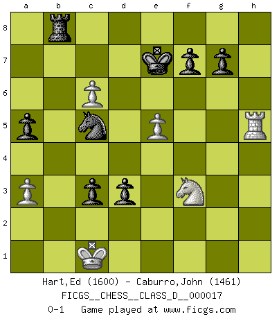 Last move : 0-1 2006 December 10 19:41:24 [Event "FICGS__CHESS__CLASS_D__000017"] [Site "FICGS"] [Date "2006.11.04"] [Round "1"] [White "Hart,Ed"] [Black "Caburro,John"] [Result "0-1"] [WhiteElo "1600"] [BlackElo "1461"] 1.e4 d5 2.exd5 Qxd5 3.d4 e5 4.c4 Qxd4 5.Qxd4 exd4 6.Bf4 Kd8 7.Nf3 Nc6 8.a3 a5 9.Nbd2 Nf6 10.Be5 Nxe5 11.Nxe5 Be6 12.O-O-O Bd6 13.f4 Ke7 14.Be2 Rhe8 15.Bf3 c6 16.h3 h5 17.g4 hxg4 18.Bg2 gxh3 19.Bxh3 Bxh3 20.Rxh3 Rh8 21.Rdh1 Rxh3 22.Rxh3 Bxe5 23.fxe5 Nd7 24.Nf3 c5 25.Kd2 Rb8 26.Rh5 b5 27.b4 bxc4 28.bxc5 c3+ 29.Kc1 d3 30.c6 Nc5 0-1 Scandinavian (centre counter) defense Queenside Castling by player White (move 12) Player Black won this chess game. Follow this game move after move (download)Chess is a terrible game. If you have no center, your opponent has a freer position. If you do have a center, then you really have something to worry about ! (Siegbert Tarrasch) Die Idee von Capablanca, Schach als Fach in den Schulen zu lehren, ist großartig. (Fidel Castro) Haz el enroque temprano y seguido. (Rob Sillars) Le joueur d'Echecs qui veut atteindre le top est obligé de développer son propre credo créatif. Alexeï Stepanovicth Souétine. Il est facile d'écrire des livres ! Ce qui est difficile, c'est de jouer ! (Alexeï Stepanovicth Souétine) Who needs drugs and alcohol if he can play Big Chess at FICGS ? (Heinz-Georg Lehnhoff)