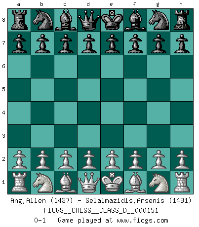 Last move : 0-1 2010 July 20 21:36:40 [Event "FICGS__CHESS__CLASS_D__000151"] [Site "FICGS"] [Date "2010.06.10"] [Round "1"] [White "Ang,Allen"] [Black "Selalmazidis,Arsenis"] [Result "0-1"] [WhiteElo "1437"] [BlackElo "1481"] 0-1 This chess game has been lost on time (started : 2010.06.10 16:2:16) Player Black won this chess game. Follow this game move after move (download)The winner of the game is the player who makes the next-to-last mistake. (Savielly Tartakover) Ich las kürzlich ein Buch von Nietzsche. Er sagte Religion verdumme nur die Menschen. Ich stimme zu. (Robert James Fischer) Un mal plan es mejor que no tener ningún plan. (Frank Marshall) Les Cavaliers se révèlent fort utiles dans les positions fermées. D'habitude, les Fous sont un peu plus forts que les Cavaliers dans les positions ouvertes. Qu'on le veuille ou non, il restera toujours des exceptions ! Beep ! (R2D2 in Star Wars ep.3)