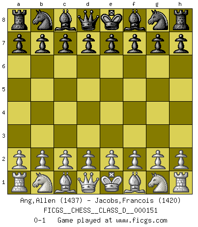 Last move : 0-1 2010 July 20 21:36:40 [Event "FICGS__CHESS__CLASS_D__000151"] [Site "FICGS"] [Date "2010.06.10"] [Round "1"] [White "Ang,Allen"] [Black "Jacobs,Francois"] [Result "0-1"] [WhiteElo "1437"] [BlackElo "1420"] 0-1 This chess game has been lost on time (started : 2010.06.10 16:2:16) Player Black won this chess game. Follow this game move after move (download)I still hope to kill Fischer. (Boris Spassky) Irgendwie scheint mir sonntags früh um 9 Uhr der Killerinstinkt verloren gegangen zu sein. (Alexej Shirov) La mitad de las variaciones que son calculadas en una partida de torneo, resultan ser completamente superfluas. Desafortunadamente, nadie sabe por adelantado cual mitad. (Jan Tinman) Si rien de grave n'est détecté lors de l'analyse d'une position, on joue alors le coup. Seconde règle de Blumenfeld. We cannot be sure of having something to live for unless we are willing to die for it. (Ernesto Che Guevara)