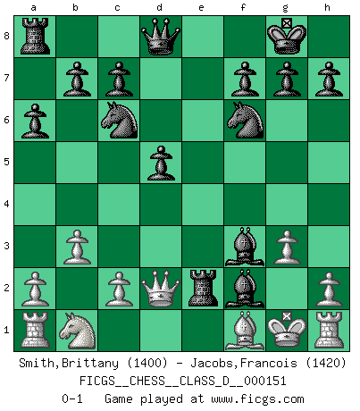 Last move : 0-1 2010 June 18 17:32:57 [Event "FICGS__CHESS__CLASS_D__000151"] [Site "FICGS"] [Date "2010.06.10"] [Round "1"] [White "Smith,Brittany"] [Black "Jacobs,Francois"] [Result "0-1"] [WhiteElo "1400"] [BlackElo "1420"] 1.d3 d5 2.f3 e5 3.e3 Nc6 4.b3 Nf6 5.Nc3 a6 6.Nh3 Bd6 7.Bd2 O-O 8.Nb1 Re8 9.f4 exf4 10.g3 fxe3 11.Bxe3 Rxe3+ 12.Kf2 Bc5 13.Kg2 Bg4 14.Qd2 Bf3+ 15.Kg1 Re2 16.d4 Bxd4+ 17.Nf2 Bxf2+ 0-1 Mieses Opening Kingside Castling by player Black (move 7) Player Black won this chess game. Follow this game move after move (download)Some sacrifices are sound; the rest are mine. (Mikhail Tal) Man gibt nur Pakete auf. (Paul Keres) Durante una competencia de Ajedrez, un Maestro de Ajedrez deberá ser una combinación de presa de caza y un Monge. (Alexander Alekhine) Nous vivons dans un monde échiquéen : chaque jour qui passe est un défi à relever. (Philosophe Sasha) Art is the only way to run away without leaving home. (Twyla Tharp)