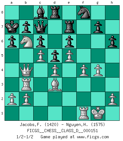 Last move : 1/2-1/2 2010 July 20 2:40:36 [Event "FICGS__CHESS__CLASS_D__000151"] [Site "FICGS"] [Date "2010.06.10"] [Round "1"] [White "Jacobs,Francois"] [Black "Nguyen,Hao Nhien"] [Result "1/2-1/2"] [WhiteElo "1420"] [BlackElo "1575"] 1.d4 d5 2.c4 e6 3.Nf3 Nf6 4.Bg5 c6 5.e3 Be7 6.Nc3 O-O 7.Rc1 Nbd7 8.Bd3 h6 9.Bh4 Re8 10.O-O a6 11.c5 Bf8 12.Ne5 Be7 13.f4 Nh7 14.Nxf7 Kxf7 15.Bxe7 Qxe7 16.Bxh7 Qf6 17.Bc2 Ke7 18.e4 Kd8 19.e5 Qe7 20.g4 Kc7 21.Qd2 Qh4 22.Qg2 Nf8 23.Rf3 Bd7 24.Na4 Rad8 25.Rh3 Qe7 26.Nb6 Bc8 27.Qd2 Kb8 28.Rb3 Ka7 29.Qb4 Qc7 30.Bd3 Re7 31.Rf1 1/2-1/2 QGD Kingside Castling by player Black (move 6) Kingside Castling by player White (move 10) This chess game ended in a draw. Follow this game move after move (download)The King is a fighting piece. Use it ! (Wilhelm Steinitz) Kombinieren und Schwarzhandel gehören verboten. (Savielly Grigorievitsch Tartakower) Una compensación adecuada por un sacrificio es tener una combinación sólida que conduce a una posición ganadora; una compensación adecuada por una metida de pata es dejar a tu oponente arrebatar una derrota de las fauces de la victoria. (Bruce A. Moon) La tactique est l'élément le plus important du milieu de jeu. (Siegbert Tarrasch) The best weapon against an enemy is another enemy. (Friedrich Nietzsche)