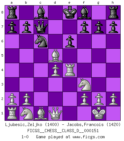 Last move : 1-0 2010 June 30 19:9:5 [Event "FICGS__CHESS__CLASS_D__000151"] [Site "FICGS"] [Date "2010.06.10"] [Round "1"] [White "Ljubesic,Zeljko"] [Black "Jacobs,Francois"] [Result "1-0"] [WhiteElo "1400"] [BlackElo "1420"] 1.e4 c5 2.Nf3 e6 3.Bc4 Nc6 4.O-O d6 5.c3 Nf6 6.Re1 Qc7 7.d4 cxd4 8.cxd4 Nxe4 9.Rxe4 d5 10.Bxd5 1-0 Sicilian defense Kingside Castling by player White (move 4) Player White won this chess game. Follow this game move after move (download)The enormous mental resilience, without which no Chess player can exist, was so much taken up by Chess that he could never free his mind of this game. (Albert Einstein) Ein Gewinn durch eine ungenaue Kombination, sei sie auch noch so vorzeigbar, erfüllt mich mit Schaudern. (Wilhelm Steinitz) No hay otro maestro que tenga una voluntad terrífica de ganar. Al tablero, el irradía peligro y aún los oponentes mas fuertes tienden a congelarse como liebres cuando olfatean a una pantera. Aún sus debilidades son peligrosas. Con las blancas, su juego de apertura es predecible - te es posible hacer planes en su contra - pero es tan fuerte que tus planes casi nunca funcionan. En el juego medio, su precisión e invención son fabulosas y en finales, tú simplemente no le puedes vencer. (Experto Alemán anónimo) Celui qui prend des risques peut perdre, celui qui n'en prend pas perd toujours. (Xavier Tartacover) Some people are so afraid to die that they never begin to live. (Henry Van Dyke)