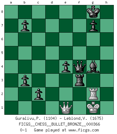 Last move : 0-1 2010 June 12 22:26:8 [Event "FICGS__CHESS__BULLET_BRONZE__000366"] [Site "FICGS"] [Date "2010.06.12"] [Round "1"] [White "Guralivu,Paul-Iosif"] [Black "Leblond,Victorien"] [Result "0-1"] [WhiteElo "1104"] [BlackElo "1675"] 1.e4 e6 2.d4 d5 3.Nd2 c5 4.exd5 exd5 5.Ngf3 Nc6 6.Bb5 Bd6 7.O-O Nge7 8.dxc5 Bxc5 9.Nb3 Bd6 10.Bg5 O-O 11.Re1 Qc7 12.h3 f6 13.Be3 Ne5 14.Nxe5 fxe5 15.c3 Be6 16.a4 Nf5 17.Bg5 e4 18.Rf1 Rf7 19.g4 a6 20.gxf5 Rxf5 21.h4 axb5 22.Nd4 Qf7 23.Qg4 bxa4 24.Nxf5 Bxf5 25.Qd1 Bh3 26.Ra2 h6 27.Re1 hxg5 28.Re3 Rf8 29.b3 Be6 30.hxg5 Qg6 31.Rg3 Bxg3 32.fxg3 Qxg5 33.Qe1 axb3 34.Re2 Rf3 35.g4 Bxg4 36.Rg2 Qf4 37.c4 dxc4 38.Kh1 c3 39.Kg1 c2 0-1 French : Tarrasch, Open variation, Main line Kingside Castling by player White (move 7) Kingside Castling by player Black (move 10) Player Black won this chess game. Follow this game move after move (download)Bobby Fischer is the greatest Chess genius of all time ! (Alexander Kotov) Alle Schachspieler sollten auch ein Hobby haben. (Savielly Grigorievitsch Tartakower) Solo el jugador con la iniciativa tiene el derecho a atacar. (Wilhelm Steinitz) Les Echecs, c'est l'art de la guerre sans les charniers, c'est la résurrection des morts tombés au champ d'honneur, l'espoir perpétuel, la suprématie de l'intelligence sur la force, la culture de l'esprit. (F. Szpiner) They say poker is a zero-sum game. It must be, because every time I play my sum ends up zero. (Max Shapiro)