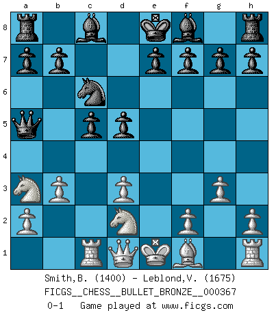 Last move : 0-1 2010 June 12 23:26:58 [Event "FICGS__CHESS__BULLET_BRONZE__000367"] [Site "FICGS"] [Date "2010.06.12"] [Round "1"] [White "Smith,Brittany"] [Black "Leblond,Victorien"] [Result "0-1"] [WhiteElo "1400"] [BlackElo "1675"] 1.e4 c5 2.Nf3 d6 3.b3 Nf6 4.Na3 Nxe4 5.g3 Nc6 6.d3 Qa5+ 7.c3 Qxc3+ 8.Bd2 Nxd2 9.Nxd2 d5 10.Rc1 Qa5 0-1 This chess game has been lost on time (started : 2010.06.12 23:14:45) Comment by player 1 : Brittany Smith : I apologize... game interference here at home... Perhaps another game? Victorien Leblond no pb... when you want to restart, pm me :) Sicilian Player Black won this chess game. Follow this game move after move (download)A Chess game is a dialogue, a conversation between a player and his opponent. Each move by the opponent may contain threats or be a blunder, but a player cannot defend against threats or take advantage of blunders if he does not first ask himself: What is my opponent planning after each move ? (Bruce A. Moon) Ich habe die besten Aussichten, den ersten Preis zu gewinnen - denn jeder muss gegen Steinitz spielen, nur ich nicht! (Wilhelm Steinitz) El estómago es una parte esencial del maestro de Ajedrez. (Bent Larsen) On n'a jamais que l'âge auquel on a commence à jouer aux échecs car après on cesse de vieillir. (Capablanca) May the force be with you. (Han Solo in Star Wars ep.4)