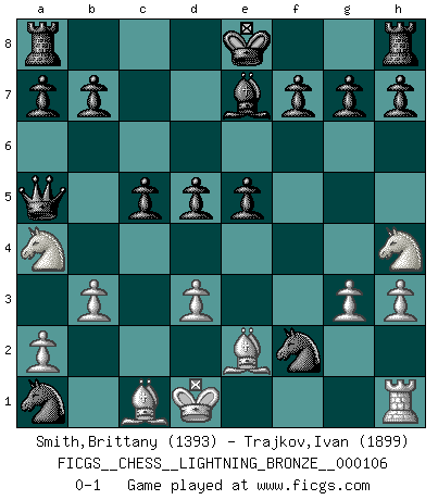 Last move : 0-1 2010 June 13 3:36:12 [Event "FICGS__CHESS__LIGHTNING_BRONZE__000106"] [Site "FICGS"] [Date "2010.06.13"] [Round "1"] [White "Smith,Brittany"] [Black "Trajkov,Ivan"] [Result "0-1"] [WhiteElo "1393"] [BlackElo "1899"] 1.e4 c5 2.b3 Nc6 3.Nf3 d6 4.g3 Nf6 5.Nc3 e5 6.Nh4 Be7 7.Na4 Nxe4 8.Qe2 d5 9.d3 Nd4 10.Qh5 Nxc2+ 11.Kd1 Bg4+ 12.Qxg4 Nxf2+ 13.Kd2 Nxg4 14.Be2 Nxa1 15.h3 Qa5+ 16.Kd1 Nf2+ 0-1 Comment by player 1 : Brittany Smith : Ah good game... I hadn't even realized my mistake until it was too late haha Sicilian defense Player Black won this chess game. Follow this game move after move (download)The battle for the ultimate truth will never be won. And that's why Chess is so fascinating. (Hans Kmoch) Die starken Figuren des Gegners muss man abtauschen. (José Raúl Capablanca) El Ajedrez lo es todo: arte, ciencia y deporte. (Anatoly Karpov) Un millionnaire : 'Monsieur Steinitz ! Vous ne participez aux tournois que pour l'argent, alors que moi je n'y viens que pour l'honneur.' Steinitz : 'Chacun joue pour ce qu'il n'a pas'... We cannot be sure of having something to live for unless we are willing to die for it. (Ernesto Che Guevara)