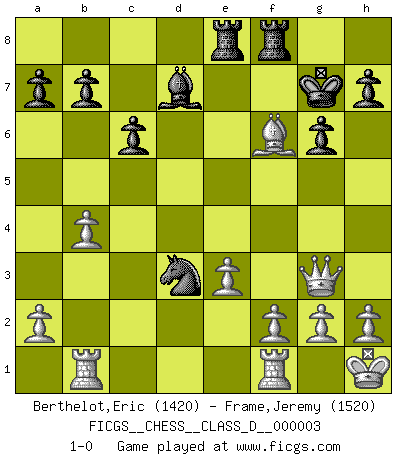 Last move : 1-0 2006 May 17 15:25:32 [Event "FICGS__CHESS__CLASS_D__000003"] [Site "FICGS"] [Date "2006.04.26"] [Round "1"] [White "Berthelot,Eric"] [Black "Frame,Jeremy"] [Result "1-0"] [WhiteElo "1420"] [BlackElo "1520"] 1.c4 e5 2.Nc3 Nf6 3.e3 d5 4.cxd5 Nxd5 5.Nxd5 Qxd5 6.Qa4+ Nc6 7.Bc4 Qd8 8.Nf3 Bd6 9.O-O Bd7 10.Qb3 Na5 11.Bxf7+ Ke7 12.Qd5 c6 13.Qe4 Kxf7 14.Nxe5+ Bxe5 15.Qxe5 Re8 16.Qh5+ g6 17.Qf3+ Qf6 18.Qg3 Kg7 19.Rb1 Rf8 20.b4 Nc4 21.d3 Ne5 22.Bb2 Rae8 23.Kh1 Nxd3 24.Bxf6+ 1-0 English Opening Kingside Castling by player White (move 9) Player White won this chess game. Follow this game move after move (download)Mistrust is the most necessary characteristic of the Chess player. (Siegbert Tarrasch) Der Umstand, daß uns eine 7 Stunden Zeitkontrolle ermöglicht eine großartige, tiefe Partie zu spielen, ist für die Massenmedien nicht weiter von Bedeutung. (Alexej Shirov) Un mal día en el Ajedrez, es mejor que cualquier buen día en el trabajo. (Anonymous) Le joueur d'Echecs qui veut atteindre le top est obligé de développer son propre credo créatif. Alexeï Stepanovicth Souétine. Il est facile d'écrire des livres ! Ce qui est difficile, c'est de jouer ! (Alexeï Stepanovicth Souétine) The meaning of life is that it is to be lived, and it is not to be traded and conceptualized and squeezed into a pattern of systems. (Bruce Lee)