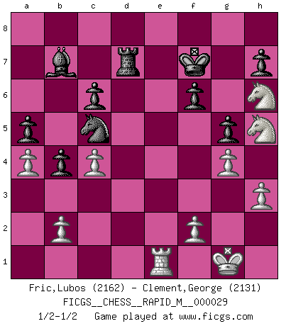 Last move : 1/2-1/2 2010 August 9 17:36:57 [Event "FICGS__CHESS__RAPID_M__000029"] [Site "FICGS"] [Date "2010.06.13"] [Round "1"] [White "Fric,Lubos"] [Black "Clement,George"] [Result "1/2-1/2"] [WhiteElo "2162"] [BlackElo "2131"] 1.e4 e5 2.Nf3 Nc6 3.Bb5 a6 4.Ba4 Nf6 5.O-O b5 6.Bb3 Bb7 7.d3 Bc5 8.a4 b4 9.Nbd2 O-O 10.Nc4 d5 11.exd5 Nd4 12.Ncxe5 Nxb3 13.cxb3 Qxd5 14.d4 Bd6 15.Re1 Ne4 16.Nd3 a5 17.Be3 f6 18.Qc2 Rfe8 19.Qc4 Rad8 20.Bf4 Qxc4 21.bxc4 Bxf4 22.Nxf4 g5 23.Nh5 Kf7 24.h3 Kg6 25.g4 Nc5 26.d5 c6 27.Rxe8 Rxe8 28.d6 Rd8 29.Nd4 Rxd6 30.Nf5 Rd7 31.Re1 Kf7 32.Nh6+ 1/2-1/2 Ruy Lopez : Archangelsk (counterthrust) variation Kingside Castling by player White (move 5) Kingside Castling by player Black (move 9) This chess game ended in a draw. Follow this game move after move (download)The most powerful weapon in Chess is to have the next move. (David Bronstein) Ich bin es gewohnt, das die Jugend mir überhaupt keinen Respekt entgegenbringt. (Alexander Morozewich) La estratégia requiere pensar, la táctica requiere observación. (Max Euwe) Même si vous avez un bon coup à faire, regardez toujours s'il n'y en a pas un qui lui soit préférable. (Pedro Damiano) God is an atheist. (Unknown)