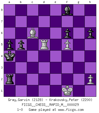 Last move : 1-0 2010 October 14 12:33:1 [Event "FICGS__CHESS__RAPID_M__000029"] [Site "FICGS"] [Date "2010.06.13"] [Round "1"] [White "Gray,Garvin"] [Black "Krakovsky,Peter"] [Result "1-0"] [WhiteElo "2128"] [BlackElo "2200"] 1.e4 c5 2.Nf3 d6 3.d4 cxd4 4.Nxd4 Nf6 5.Nc3 a6 6.Bg5 e6 7.f4 Qb6 8.Qd2 Qxb2 9.Rb1 Qa3 10.e5 h6 11.Bxf6 gxf6 12.exd6 Nd7 13.Be2 Qxd6 14.O-O e5 15.Nb3 Qxd2 16.Nxd2 f5 17.Nb3 e4 18.Nd5 Ra7 19.Rfd1 Bg7 20.Nd4 Nc5 21.Rb6 Kf8 22.Nc3 Nd3 23.Rd6 Nxf4 24.g3 Ke7 25.gxf4 Kxd6 26.Ndb5+ Kc5 27.Rd5+ Kb6 28.Na4+ Ka5 29.Nxa7 Kxa4 30.Nxc8 Rxc8 31.Kf1 Rc7 32.Bh5 b5 33.Rxf5 f6 34.Rd5 Ka3 35.Bg6 Rxc2 36.Bxe4 Rxa2 37.Rd6 Kb4 38.f5 a5 39.Rd4+ Ka3 40.Rd3+ Ka4 41.Bc6 Bf8 42.Rd5 1-0 Sicilian : Najdorf, 7...Qb6 Kingside Castling by player White (move 14) Player White won this chess game. Follow this game move after move (download)It is peculiar but a fact nevertheless, that gamblers in chess always have enthusiastic followers. (Botvinnik) Offensichtlich kennt Kasparow nichts anderes als Schach, und ich könnte 500 weitere Spieler dieser Sorte benennen. (Judith Polgar) Los tropiezos estan todos ahí en el tablero, esperando que se cometan. (Savielly Tartakover) Nous vivons dans un monde échiquéen : chaque jour qui passe est un défi à relever. (Philosophe Sasha) We're missing something. (Gregory House, House M.D.)
