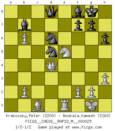 Last move : 1/2-1/2 2010 September 10 5:18:16 [Event "FICGS__CHESS__RAPID_M__000029"] [Site "FICGS"] [Date "2010.06.13"] [Round "1"] [White "Krakovsky,Peter"] [Black "Nookala,Kamesh"] [Result "1/2-1/2"] [WhiteElo "2200"] [BlackElo "2163"] 1.e4 e5 2.Nf3 Nc6 3.Bb5 a6 4.Ba4 Nf6 5.O-O Be7 6.Re1 b5 7.Bb3 d6 8.c3 O-O 9.h3 Bb7 10.d4 Re8 11.Nbd2 Bf8 12.a4 h6 13.d5 Nb8 14.c4 c6 15.dxc6 Nxc6 16.axb5 axb5 17.Rxa8 Qxa8 18.cxb5 Nb4 19.b6 d5 20.exd5 e4 21.Ba4 exf3 22.Bxe8 Nxe8 23.Nxf3 Nxd5 24.Qd4 Nd6 25.Ne5 Qd8 1/2-1/2 Ruy Lopez : Closed Kingside Castling by player White (move 5) Kingside Castling by player Black (move 8) This chess game ended in a draw. Follow this game move after move (download)Checkers is for tramps. (Paul Morphy) Ohne ihre Erfolge schmälern zu wollen würde ich sagen Petrosian, Spassky und Karpov verdanken ihre Siege ihren Trainern - Boleslavsky, Bondarevsky und Furman. (Mikhail Moiseyevich Botvinik) Desconfianza es la característica mas necesaria de un jugador de Ajedrez. (Siegbert Tarrasch) Le système Elo représente seulement une moyenne. Il est simplement un indicateur de votre stabilité. (Anatoli Karpov) The right perception of any matter and a misunderstanding of the same matter do not wholly exclude each other. (Kafka's the trial)