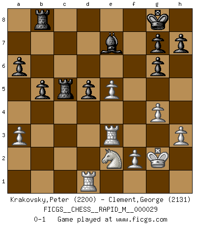 Last move : 0-1 2010 August 23 10:44:13 [Event "FICGS__CHESS__RAPID_M__000029"] [Site "FICGS"] [Date "2010.06.13"] [Round "1"] [White "Krakovsky,Peter"] [Black "Clement,George"] [Result "0-1"] [WhiteElo "2200"] [BlackElo "2131"] 1.e4 e5 2.Nf3 Nc6 3.Bb5 a6 4.Ba4 Nf6 5.O-O Be7 6.Re1 b5 7.Bb3 d6 8.c3 O-O 9.d4 Bg4 10.Be3 exd4 11.cxd4 d5 12.e5 Ne4 13.Nc3 Nxc3 14.bxc3 Na5 15.Bc2 Nc4 16.h3 Bh5 17.g4 Bg6 18.Bf5 Rb8 19.Nd2 Nxe3 20.Rxe3 c5 21.Bxg6 fxg6 22.a3 cxd4 23.cxd4 Qb6 24.Kg2 Qxd4 25.Nf3 Qxd1 26.Rxd1 Rfd8 27.Nd4 Rdc8 28.Ne2 Rc5 0-1 This chess game has been lost on time (started : 2010.06.13 5:13:28) Ruy Lopez : Closed Kingside Castling by player White (move 5) Kingside Castling by player Black (move 8) Player Black won this chess game. Follow this game move after move (download)If one piece is badly posted, the whole game is bad. (Tarrasch) Vielleicht wirkt die Aura früherer Spieler glanzvoller als die der heutigen Spieler, aber das liegt daran, dass man kein Programm wie Fritz hatte, das einem all die Löcher in ihren Partien zeigt. (Vladimir Kramnik) Jugadores de primera clase pierden en contra de jugadores de segunda clase porque los jugadores de segunda clase a veces juegan una partida de primer clase. (Siegbert Tarrasch) C'est la seule position que je connaisse où les deux camps sont mals. Propos prêtés à V. Anand. Depression is just anger without enthusiasm. (Unknown)