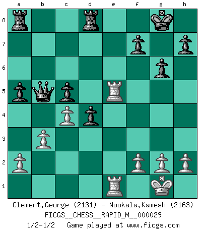 Last move : 1/2-1/2 2010 July 21 17:14:12 [Event "FICGS__CHESS__RAPID_M__000029"] [Site "FICGS"] [Date "2010.06.13"] [Round "1"] [White "Clement,George"] [Black "Nookala,Kamesh"] [Result "1/2-1/2"] [WhiteElo "2131"] [BlackElo "2163"] 1.e4 e5 2.Nf3 Nc6 3.d4 exd4 4.Nxd4 Nf6 5.Nxc6 bxc6 6.Bd3 d5 7.exd5 cxd5 8.O-O Be7 9.c4 d4 10.Bf4 O-O 11.Nd2 Bb7 12.Re1 c5 13.Ne4 Nxe4 14.Bxe4 Bxe4 15.Rxe4 a5 16.Qa4 Bg5 17.Bxg5 Qxg5 18.Re2 Qd8 19.Rae1 Qb6 20.b3 g6 21.Re5 Rfd8 22.Qb5 Qxb5 1/2-1/2 Scotch : Schmidt variation Kingside Castling by player White (move 8) Kingside Castling by player Black (move 10) This chess game ended in a draw. Follow this game move after move (download)In Chess, at least, the brave inherit the earth. (Edmar Mednis) Man gibt nur Pakete auf. (Paul Keres) Nunca nadie ha ganado una partida de Ajedrez rindiendose. (Unknown) Les sacrifices démontrent seulement que quelqu'un a gaffé. (Savielly Tartacover) There's no money in correspondence chess. (John Knudsen)