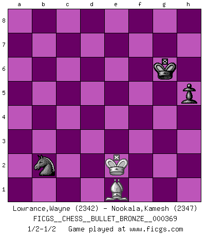 Last move : 1/2-1/2 2010 June 13 7:26:33 [Event "FICGS__CHESS__BULLET_BRONZE__000369"] [Site "FICGS"] [Date "2010.06.13"] [Round "1"] [White "Lowrance,Wayne"] [Black "Nookala,Kamesh"] [Result "1/2-1/2"] [WhiteElo "2342"] [BlackElo "2347"] 1.Nf3 d5 2.c4 c6 3.d4 Nf6 4.e3 e6 5.Nc3 Nbd7 6.Qc2 Bd6 7.b3 O-O 8.Bb2 e5 9.Be2 e4 10.Nd2 a6 11.g4 Rb8 12.Rg1 b5 13.g5 Ne8 14.cxd5 cxd5 15.Nxd5 Bb7 16.Nc3 Rc8 17.a3 f5 18.b4 Bxh2 19.Qb3+ Kh8 20.Rh1 Bb8 21.g6 h6 22.a4 f4 23.axb5 fxe3 24.fxe3 axb5 25.Bg4 Nd6 26.Ke2 Qg5 27.Rag1 Nf5 28.Bxf5 Qxf5 29.Rxh6+ gxh6 30.g7+ Kh7 31.gxf8Q Rxf8 32.Kd1 Nf6 33.Rf1 Qc8 34.Kc1 h5 35.d5 Bxd5 36.Qc2 Bb7 37.Nxb5 Ng4 38.Rxf8 Qxf8 39.Nc3 Nxe3 40.Qa4 Qc8 41.Kb1 Kg6 42.Ndxe4 Be5 43.Nc5 Bxc3 44.Bxc3 Bc6 45.b5 Qf5+ 46.Kc1 Bxb5 47.Qe4 Qxe4 48.Nxe4 Bd7 49.Be1 Nd5 50.Kd2 Bf5 51.Nc3 Nb6 52.Ke3 Bg4 53.Ne2 Nc4+ 54.Kd3 Nb2+ 55.Ke3 Bxe2 56.Kxe2 1/2-1/2 Reti Opening Kingside Castling by player Black (move 7) Promotion Queen by player White (move 31) 10 pieces endgame at move 44 : White KQBNP , Black KQBNP WHITE : King + 1 Queen 1 Bishop 1 Knight 1 Pawn BLACK : King + 1 Queen 1 Bishop 1 Knight 1 Pawn 9 pieces endgame at move 46 : White KQBN , Black KQBNP WHITE : King + 1 Queen 1 Bishop 1 Knight BLACK : King + 1 Queen 1 Bishop 1 Knight 1 Pawn 8 pieces endgame at move 47 : White KBN , Black KQBNP WHITE : King + 1 Bishop 1 Knight BLACK : King + 1 Queen 1 Bishop 1 Knight 1 Pawn 7 pieces endgame at move 48 : White KBN , Black KBNP WHITE : King + 1 Bishop 1 Knight BLACK : King + 1 Bishop 1 Knight 1 Pawn 6 pieces endgame at move 55 : White KB , Black KBNP WHITE : King + 1 Bishop BLACK : King + 1 Bishop 1 Knight 1 Pawn 5 pieces endgame at move 56 : White KB , Black KNP WHITE : King + 1 Bishop BLACK : King + 1 Knight 1 Pawn This chess game ended in a draw. Follow this game move after move (download)All Chess players should have a hobby. (Savielly Tartakower) Wie bekannt hörte Morphy 1859 auf, Schach zu spielen. Seine Enttäuschung galt nicht so sehr dem Schach, wie den Schachspielern. (Robert James Fischer) La única cosa que los jugadores de Ajedrez tienen en común, es el Ajedrez. (Lodewijk Prins) Les erreurs sont comme les malheurs, elles n'arrivent jamais seules. (Siegbert Tarrasch) Political correctness is subjecting us to gross incompetence. (Johann Piek)
