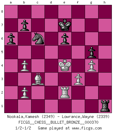 Last move : 1/2-1/2 2010 June 13 8:7:28 [Event "FICGS__CHESS__BULLET_BRONZE__000370"] [Site "FICGS"] [Date "2010.06.13"] [Round "1"] [White "Nookala,Kamesh"] [Black "Lowrance,Wayne"] [Result "1/2-1/2"] [WhiteElo "2349"] [BlackElo "2339"] 1.e4 c6 2.d4 d5 3.e5 Bf5 4.Nf3 e6 5.Be2 c5 6.Be3 cxd4 7.Nxd4 Ne7 8.c4 Nbc6 9.Qa4 a6 10.Na3 Qa5+ 11.Qxa5 Nxa5 12.O-O dxc4 13.Nxc4 Nxc4 14.Bxc4 Be4 15.Rac1 Bd5 16.Bd3 Rd8 17.Bc2 f6 18.Bb3 Bxb3 19.axb3 Kd7 20.Rfe1 fxe5 21.Nf3 Nc6 22.Bb6 Rc8 23.Rxe5 Bd6 24.R5e1 Rhf8 25.Ng5 Rce8 26.Ne4 Rf5 27.Rcd1 Rd5 28.Nxd6 Kxd6 29.Rxd5+ Kxd5 30.Rd1+ Ke4 31.f3+ Kf4 32.Kf2 h5 33.g3+ Kf5 34.h3 Re7 35.g4+ hxg4 36.hxg4+ Ke5 37.Be3 Rf7 38.Bc5 g6 39.Be3 Kf6 40.Kg3 Ke5 41.Bc5 Rh7 42.Bf2 Rf7 43.Bb6 Rh7 44.Rd2 Kf6 45.Be3 g5 46.Rd6 Rf7 47.Bd2 Ke5 48.Rd3 Kf6 49.b4 Rh7 50.Kg2 Rf7 51.Kf2 Rh7 52.Ke3 Rf7 53.Bc3+ Ke7 54.Rd2 Rh7 55.Ke4 Rh4 56.Rf2 Rh1 57.Rc2 Kf7 58.Rd2 Ke7 59.Re2 1/2-1/2 Caro-Kann : Advance variation Kingside Castling by player White (move 12) This chess game ended in a draw. Follow this game move after move (download)As one by one I mowed them down, my superiority soon became apparent. (Jose Capablanca) Es genügt nicht ein guter Spieler zu sein, man muß auch gut spielen. (Siegbert Tarrasch) Un buen sacrificio es aquel que aunque no sea necesariamente sólido, deja a tu oponente aturdido y confuso. (Rudolph Spielmann) Même si vous avez un bon coup à faire, regardez toujours s'il n'y en a pas un qui lui soit préférable. (Pedro Damiano) 'preceded by its own quotation yields a falsehood' preceded by its own quotation yields a falsehood. (W. V. O. Quine - Set Theory And Its Logic, 1953)