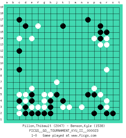 Last move : 1-0 2010 September 22 9:0:34 [Event "FICGS__GO__TOURNAMENT_KYU_II__000023 "] [Site "FICGS"] [Date "2010.06.15"] [Round "1"] [Black "Pillon,Thibault "] [White "Benson,Kyle "] [Result "1-0"] [Rating 1 "2047"] [Rating 2 "1538"] 1.q16 e3 2.d16 q5 3.c4 c3 4.d3 d4 5.d2 c2 6.e4 d5 7.e2 f3 8.f2 c5 9.e5 g3 10.q3 r3 11.r2 r4 12.p2 r9 13.h2 e6 14.h3 g5 15.k16 c14 16.c12 e14 17.c9 f16 18.c17 r14 19.q14 q13 20.r15 p14 21.q15 r13 22.o17 n3 23.s2 k3 24.h4 h5 25.g2 g4 26.k4 l3 27.j5 j7 28.p5 p6 29.o5 1-0 This go game has been lost on time (started : 2010.06.15 15:28:23) Here are the names of the openings (joseki) played in the four corners : Corner d4 : e3 c4Mokuhazushi (Waemok, Wai`mu`) 5-3 Point. The mokuhazushi (5-3) point was popular in the Edo period in Japan (1600 - 1867). It emphasizes influence; territorially, it is inferior to the 3-4 point.Komoku Kakari. Black 2 is the standard approach because of its solidity and stability. Corner q4 : q5 q3Takamoku (Gomok, Gaomu`) 5-4 Point. The takamoku (high) point (5-4). With its emphasis on influence, the 5-4 point complements the 4-4 (hoshi) point in creating an influence-oriented fuseki.Komoku. White responds with 3-3, 3-5, 4-6, 4-7, 3-6, 3-7. Corner d16 : d16 c14Hoshi (Hwajeom, Seongjeom, Xingwei`) 4-4 Point. The star or hoshi (4-4) point, emphasizing influence at the potential expense of territory.Ikken Kakari (Hankan Keolch'im, Yi Gua`jiao~, 1-Space Low Approach). White 2 is the standard approach move to the 4-4. Corner q16 : q16 r14Hoshi (Hwajeom, Seongjeom, Xingwei`) 4-4 Point. The star or hoshi (4-4) point, emphasizing influence at the potential expense of territory.Ikken Kakari (Hankan Keolch'im, Yi Gua`jiao~, 1-Space Low Approach). White 2 is the standard approach move to the 4-4. Player Black won this Go (weiqi, baduk) game.Follow this game move after move (download ) You don't have to be really good anymore to get good results. What's happening with chess is that it's gradually losing its place as the par excellence of intellectual activity. Smart people in search of a challenging board game might try a game called Go. (Hans Berliner, The New York Times, 2003) The arrogant army will lose certainly the battle. (Chinese proverb)
