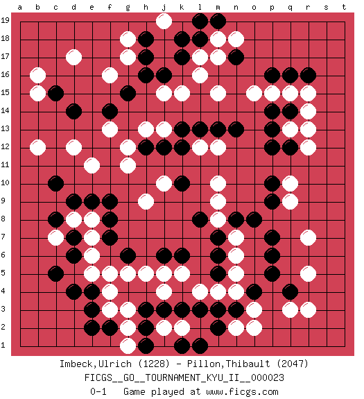 Last move : 0-1 2010 November 28 2:13:5 [Event "FICGS__GO__TOURNAMENT_KYU_II__000023"] [Site "FICGS"] [Date "2010.06.15"] [Round "1"] [Black "Imbeck,Ulrich"] [White "Pillon,Thibault"] [Result "0-1"] [Rating 1 "1228"] [Rating 2 "2047"] 1.q16 d17 2.d4 r3 3.c15 d12 4.d14 f16 5.c10 e11 6.h16 b16 7.f14 c7 8.d9 e7 9.f9 g11 10.f7 e8 11.e9 e5 12.e4 f5 13.f8 r14 14.n17 q10 15.q12 r12 16.q14 q13 17.p13 r13 18.p12 q15 19.p14 p15 20.p16 o15 21.p10 q9 22.p9 l16 23.k17 l17 24.r16 r15 25.g15 b12 26.k3 f4 27.c5 f3 28.e3 k5 29.m3 j10 30.p7 o3 31.h3 h5 32.f2 g2 33.e2 g3 34.m5 l4 35.l3 m4 36.h2 g1 37.h1 n2 38.m2 n4 39.d6 e6 40.d7 d8 41.c8 j4 42.l1 k2 43.k1 j2 44.j3 r7 45.p5 r5 46.q4 q3 47.m7 n6 48.o4 n5 49.m6 m10 50.n3 o2 51.g6 g5 52.j6 j5 53.k6 n7 54.n8 m8 55.l8 m9 56.p6 g17 57.o8 m12 58.n13 m15 59.m13 l12 60.l13 j15 61.k13 j13 62.j12 h13 63.h12 g12 64.k12 f13 65.k10 h9 66.j16 k15 67.l18 m18 68.k18 m17 69.h18 g18 70.h17 b15 71.m19 n18 72.l19 j19 0-1 Here are the names of the openings (joseki) played in the four corners : Corner d16 : d17 c15 Komoku (Somok, Xiao~mu`) 3-4 Point. The komoku (3-4) point is the traditional corner enclosure move.. Ikken Kakari (Hankan Keolch'im, Yi Gua`jiao~, 1-Space Low Pincer). The small knight move is the basic approach move to the 3-4 point stone. It has been continually used for over four centuries. There are limitless variations, with new moves constantly being discovered. Black 2 opens the door to a treaure store of joseki. Corner d4 : d4 c7 Hoshi (Hwajeom, Seongjeom, Xingwei`) 4-4 Point. The star or hoshi (4-4) point, emphasizing influence at the potential expense of territory. Niken Kakari (Dukan Keolch'im, E`r Gua`jiao~, 2-Space Low Approach). Black typically answers by 7-3 or 3-5 (which is not joseki). Corner q16 : q16 r14 Hoshi (Hwajeom, Seongjeom, Xingwei`) 4-4 Point. The star or hoshi (4-4) point, emphasizing influence at the potential expense of territory. Ikken Kakari (Hankan Keolch'im, Yi Gua`jiao~, 1-Space Low Approach). White 2 is the standard approach move to the 4-4. Player White won this Go (weiqi, baduk) game. Follow this game move after move (download)The weak player fears ko, the strong player seeks it. (Bill Taylor) Mandala - that's it! 16x16 squares as multiple of the four and the eight because of the Four Noble Truths and the Noble Eightfold Path. (Heinz-Georg Lehnhoff about Big Chess)