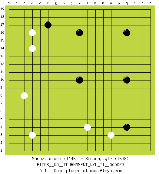 Last move : 0-1 2010 August 10 22:29:39 [Event "FICGS__GO__TOURNAMENT_KYU_II__000023"] [Site "FICGS"] [Date "2010.06.15"] [Round "1"] [Black "Munoz,Lazaro"] [White "Benson,Kyle"] [Result "0-1"] [Rating 1 "1145"] [Rating 2 "1538"] 1.q16 d3 2.q4 d16 3.q10 c8 4.k16 l4 5.k10 o3 6.f17 d14 0-1 This go game has been lost on time (started : 2010.06.15 15:28:23) Here are the names of the openings (joseki) played in the four corners : Corner q4 : q4 l4 Hoshi (Hwajeom, Seongjeom, Xingwei`) 4-4 Point. The star or hoshi (4-4) point, emphasizing influence at the potential expense of territory. Corner d16 : d16 f17 Hoshi (Hwajeom, Seongjeom, Xingwei`) 4-4 Point. The star or hoshi (4-4) point, emphasizing influence at the potential expense of territory. Ikken Kakari (Hankan Keolch'im, Yi Gua`jiao~, 1-Space Low Approach). Black 2 is the standard approach move to the 4-4. Player White won this Go (weiqi, baduk) game. Follow this game move after move (download)Five groups might live but the six will die. (Anonymous) It is the aim of the modern school, not to treat every position according to one general law, but according to the principle inherent in the position. (Richard Reti)