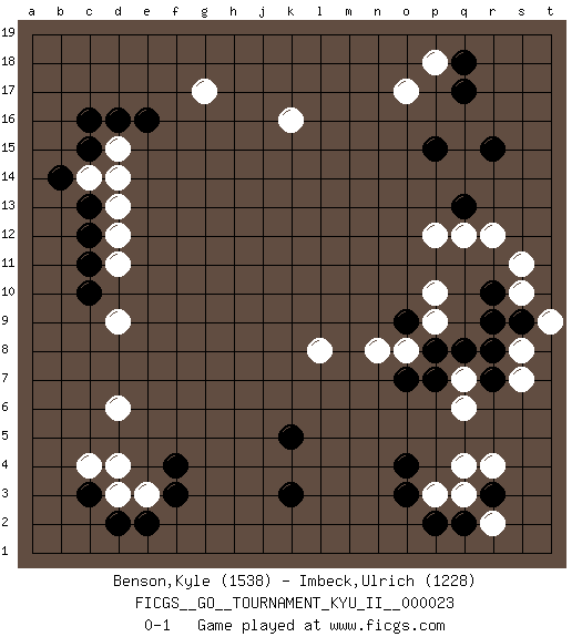 Last move : 0-1 2010 September 25 9:6:35 [Event "FICGS__GO__TOURNAMENT_KYU_II__000023"] [Site "FICGS"] [Date "2010.06.15"] [Round "1"] [Black "Benson,Kyle"] [White "Imbeck,Ulrich"] [Result "0-1"] [Rating 1 "1538"] [Rating 2 "1228"] 1.q17 q4 2.c16 d4 3.r15 c14 4.e16 d11 5.k3 r12 6.o3 p3 7.o4 q6 8.f3 e3 9.f4 d6 10.c12 d12 11.c13 d13 12.b14 d15 13.c15 d14 14.d16 k16 15.c11 d9 16.c10 g17 17.r9 s10 18.r3 r4 19.p2 q3 20.q2 r2 21.c3 c4 22.e2 d3 23.d2 o17 24.p15 p18 25.q18 s8 26.s9 t9 27.r8 s7 28.r10 s11 29.k5 p12 30.q13 q12 31.o9 p9 32.p8 p10 33.r7 q7 34.q8 o8 35.o7 n8 36.p7 l8 0-1 This go game has been lost on time (started : 2010.06.15 15:28:23) Here are the names of the openings (joseki) played in the four corners : Corner d16 : c16 c14 Komoku (Somok, Xiao~mu`) 3-4 Point. The komoku (3-4) point is the traditional corner enclosure move.. Corner q4 : q4 o3 Hoshi (Hwajeom, Seongjeom, Xingwei`) 4-4 Point. The star or hoshi (4-4) point, emphasizing influence at the potential expense of territory. Ikken Kakari (Hankan Keolch'im, Yi Gua`jiao~, 1-Space Low Approach). Black 2 is the standard approach move to the 4-4. Corner d4 : d4 f3 Hoshi (Hwajeom, Seongjeom, Xingwei`) 4-4 Point. The star or hoshi (4-4) point, emphasizing influence at the potential expense of territory. Ikken Kakari (Hankan Keolch'im, Yi Gua`jiao~, 1-Space Low Approach). Black 2 is the standard approach move to the 4-4. Player White won this Go (weiqi, baduk) game. Follow this game move after move (download)Everything happens on a grid-engraved board with black and white pieces, but if that's all you see then you don't know Go. (Pierre Audouard) You can think I'm wrong, but that's no reason to quit thinking. (Gregory House, House M.D.)