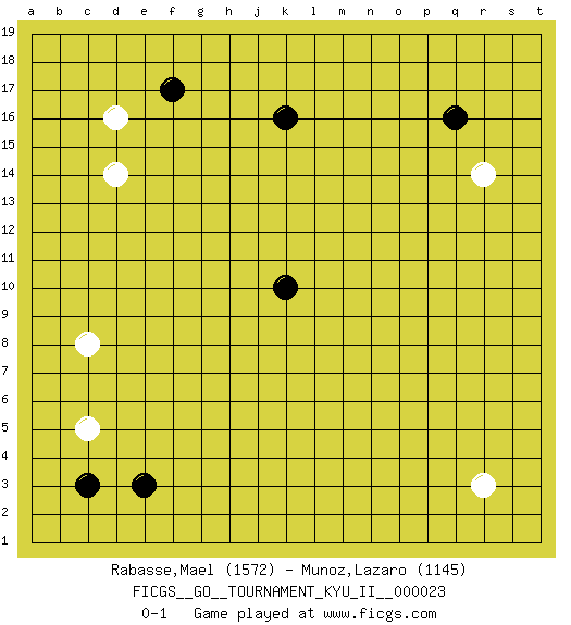 Last move : 0-1 2010 August 24 10:46:10 [Event "FICGS__GO__TOURNAMENT_KYU_II__000023 "] [Site "FICGS"] [Date "2010.06.15"] [Round "1"] [Black "Rabasse,Mael "] [White "Munoz,Lazaro "] [Result "0-1"] [Rating 1 "1572"] [Rating 2 "1145"] 1.q16 d16 2.c3 r3 3.k10 c5 4.e3 c8 5.f17 d14 6.k16 r14 0-1 This go game has been lost on time (started : 2010.06.15 15:28:23) Here are the names of the openings (joseki) played in the four corners : Corner d4 : c3 c5San-San (Sam-Sam, San-San) 3-3 Point. The San-San (3-3) point, emphasizing territory at the expense of influence.Ikken Kakari (Hankan Keolch'im, Yi Gua`, Jiao~, 1-Space Approach). Black may continue by playing 4-5, 3-5, 4-6, 3-6 or 5-4. Corner d16 : d16 f17Hoshi (Hwajeom, Seongjeom, Xingwei`) 4-4 Point. The star or hoshi (4-4) point, emphasizing influence at the potential expense of territory.Ikken Kakari (Hankan Keolch'im, Yi Gua`jiao~, 1-Space Low Approach). Black 2 is the standard approach move to the 4-4. Corner q16 : q16 r14Hoshi (Hwajeom, Seongjeom, Xingwei`) 4-4 Point. The star or hoshi (4-4) point, emphasizing influence at the potential expense of territory.Ikken Kakari (Hankan Keolch'im, Yi Gua`jiao~, 1-Space Low Approach). White 2 is the standard approach move to the 4-4. Corner q4 : r3 0-1San-San (Sam-Sam, San-San) 3-3 Point. The San-San (3-3) point, emphasizing territory at the expense of influence. Player White won this Go (weiqi, baduk) game.Follow this game move after move (download ) When your opponent has two weak groups, attack them both at once. (Anonymous) The intuitive mind is a sacred gift; the rational mind is a faithful servant. We have created a society that honors the servant but has forgotten the gift. (Albert Einstein)