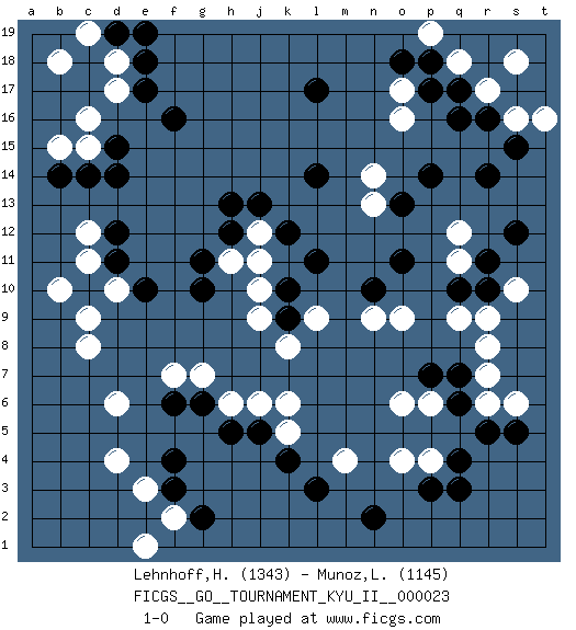 Last move : 1-0 2010 December 4 13:46:53 [Event "FICGS__GO__TOURNAMENT_KYU_II__000023"] [Site "FICGS"] [Date "2010.06.15"] [Round "1"] [Black "Lehnhoff,Heinz-Georg"] [White "Munoz,Lazaro"] [Result "1-0"] [Rating 1 "1343"] [Rating 2 "1145"] 1.q16 d4 2.q3 d17 3.d15 c12 4.f16 c15 5.c14 c16 6.b14 b15 7.e18 d18 8.d14 q9 9.r5 q12 10.c10 c8 11.f3 e3 12.f4 d6 13.k4 o17 14.r14 r7 15.l17 r17 16.q17 q18 17.p18 s18 18.p17 p19 19.o18 o16 20.p14 n14 21.r16 s16 22.s12 s10 23.o13 n13 24.o11 o9 25.n10 n9 26.l11 l9 27.k12 d10 28.d11 c11 29.d12 c9 30.e10 b10 31.e17 p4 32.p3 o4 33.n2 m4 34.l3 k5 35.j5 k6 36.l14 j10 37.h12 j6 38.g10 h11 39.g11 j12 40.j13 j11 41.s15 t16 42.h5 f2 43.g2 e1 44.d19 c19 45.e19 b18 46.q6 p6 47.q7 r8 48.q4 r6 49.s5 s6 50.p7 o6 51.k10 j9 52.k9 k8 53.h13 h6 54.g6 g7 55.f6 f7 56.r11 q11 57.r10 r9 58.q10 1-0 Here are the names of the openings (joseki) played in the four corners : Corner d16 : d17 d15 Komoku (Somok, Xiao~mu`) 3-4 Point. The komoku (3-4) point is the traditional corner enclosure move.. Ikken Takagakari (Hankan Nop'dakeolch'im, Yi Gaogua`jiao~, 1-Space High Approach). The 5-4 approach move has become more popular in modern times, as modern Go emphasizes speed and influence. Corner q4 : q3 q9 Komoku (Somok, Xiao~mu`) 3-4 Point. The komoku (3-4) point is the traditional corner enclosure move.. Corner q16 : q16 q12 Hoshi (Hwajeom, Seongjeom, Xingwei`) 4-4 Point. The star or hoshi (4-4) point, emphasizing influence at the potential expense of territory. Player Black won this Go (weiqi, baduk) game. Follow this game move after move (download)On the third line, four die, six live. (Anonymous) It is not enough to be a good player... you must also play well. (Siegbert Tarrasch)