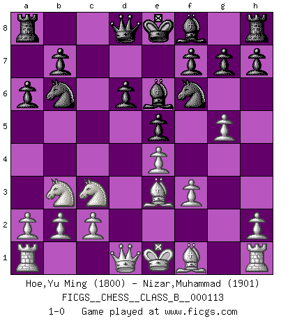 Last move : 1-0 2010 July 29 17:43:59 [Event "FICGS__CHESS__CLASS_B__000113"] [Site "FICGS"] [Date "2010.06.16"] [Round "1"] [White "Hoe,Yu Ming"] [Black "Nizar,Muhammad"] [Result "1-0"] [WhiteElo "1800"] [BlackElo "1901"] 1.e4 c5 2.Nf3 d6 3.d4 cxd4 4.Nxd4 Nf6 5.Nc3 a6 6.f3 e5 7.Nb3 Be6 8.Be3 Nbd7 9.g4 Nb6 10.g5 1-0 Sicilian : Najdorf Player White won this chess game. Follow this game move after move (download)When you see a good move, look for a better one. (Emanuel Lasker) Du musst Deinen Gegner in einen tiefen dunklen Wald führen wo 2+2=5 ist und wo der Weg, der wieder hinausführt, nur breit genug für einen ist. (Mikhail Nekhemyevich Tal) En el Ajedrez, tal como en la vida, las bendiciones de hoy pueden ser el veneno del mañana. (Assaic) Les réformistes prétendent que les progrès de la théorie conduiront à la disparition des échecs, et qu'il faut, pour leur rendre vie, en remanier les règles. En réalité, qu'exprime cette affirmation? Le mépris de l'intuition, de l'imagination et de tous les autres éléments qui font des échecs un art. (Alexander Alekhine) Nowadays, anyone who cannot speak English and is incapable of using the Internet is regarded as backward. (Al-Waleed bin Talal)