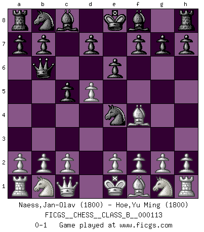 Last move : 0-1 2010 July 29 9:51:20 [Event "FICGS__CHESS__CLASS_B__000113"] [Site "FICGS"] [Date "2010.06.16"] [Round "1"] [White "Naess,Jan-Olav"] [Black "Hoe,Yu Ming"] [Result "0-1"] [WhiteElo "1800"] [BlackElo "1800"] 1.d4 Nf6 2.Bg5 c5 3.d5 Ne4 4.Bf4 Qb6 5.Qc1 e6 0-1 This chess game has been lost on time (started : 2010.06.16 12:53:58) Trompowsky attack (Ruth, Opovcensky Opening) Player Black won this chess game. Follow this game move after move (download)Chess is a fighting game which is purely intellectual and includes chance. (Richard Reti) Wer sich die Fähigkeit anerziehen will im Schach selbstständig zu denken, der muß alles meiden, was leblos ist: ausgeklügelte Theorien, die sich auf sehr wenige Beispiele und eine Menge Hirngespinste stützen. (Emanuel Lasker) Te sientas frente a un tablero y repentinamente tu corazón brinca. Tu mano tiembla al tomar una pieza y moverla. Pero lo que el Ajedrez te enseña es que tu debes permanecer ahí con calma y pensar de que si realmente es una buena idea o de que si hay otras ideas mejores. (Stanley Kubrick) Le système Elo représente seulement une moyenne. Il est simplement un indicateur de votre stabilité. (Anatoli Karpov) Strategy without tactics is the slowest route to victory. Tactics without strategy is the noise before defeat. (Sun Tzu)