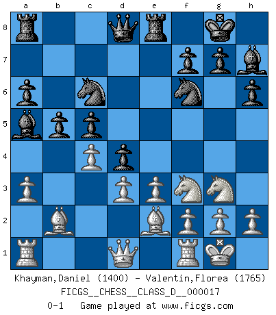 Last move : 0-1 2006 December 26 15:44:14 [Event "FICGS__CHESS__CLASS_D__000017"] [Site "FICGS"] [Date "2006.11.04"] [Round "1"] [White "Khayman,Daniel"] [Black "Valentin,Florea"] [Result "0-1"] [WhiteElo "1400"] [BlackElo "1765"] 1.b4 e5 2.Bb2 Bxb4 3.Bxe5 Nf6 4.Nf3 O-O 5.e3 d5 6.Be2 c5 7.O-O Nc6 8.Bb2 Bf5 9.d3 Re8 10.a3 Ba5 11.Nbd2 Bc7 12.Nb3 b6 13.Re1 h6 14.Nbd2 a6 15.Nf1 b5 16.Ng3 Bh7 17.c4 Ba5 18.Rf1 d4 0-1 Polish (Sokolsky) opening Kingside Castling by player Black (move 4) Kingside Castling by player White (move 7) Player Black won this chess game. Follow this game move after move (download)One doesn't have to play well, it's enough to play better than your opponent. (Siegbert Tarrasch) Ich verlor meine Bürgerrechte, mein Gehalt wurde mir nicht mehr bezahlt und ich wurde zensiert und durfte nicht mehr ins Ausland reisen. [nach dem Match Fischer-Taimanov 6:0] (Mark Taimanov) El jugador blanco perdió porque fallo en recordar la coreccta continuación y tuvo que pensar por sí mismo las movidas. (Siegbert Tarrasch) Les Echecs ont trois composantes : le temps, l'espace et le matériel en dernier. (Mikhail Tal) If you are going through hell, keep going. (Winston Churchill)