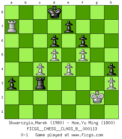 Last move : 0-1 2010 September 7 13:9:30 [Event "FICGS__CHESS__CLASS_B__000113"] [Site "FICGS"] [Date "2010.06.16"] [Round "1"] [White "Skwarczylo,Marek"] [Black "Hoe,Yu Ming"] [Result "0-1"] [WhiteElo "1980"] [BlackElo "1800"] 1.d4 Nf6 2.Nf3 c5 3.d5 g6 4.c4 b5 5.cxb5 a6 6.e3 Bg7 7.Nc3 O-O 8.Qb3 d6 9.b6 Bb7 10.Bc4 Nbd7 11.Na4 Ne4 12.Nd2 Nef6 13.e4 Rb8 14.O-O Bc8 15.Qc2 Nxb6 16.Nxb6 Qxb6 17.Be2 Qa7 18.Nc4 Ng4 19.Bd2 Ne5 20.Bc3 Nxc4 21.Bxc4 a5 22.Bxg7 Kxg7 23.Qc3+ f6 24.f4 Qb6 25.Rf2 Ba6 26.Rd1 Bxc4 27.Qxc4 Qa7 28.Re1 Rb4 29.Qc3 a4 30.g3 Rd4 31.Rd2 Ra8 32.Kg2 Rb8 33.R1e2 R8b4 34.Rxd4 Rxd4 35.Qc2 Qa6 36.Kf2 a3 37.b3 Qb6 38.Kf3 c4 39.Re3 Qa5 40.bxc4 Rd2 41.Qc3 Qxc3 42.Rxc3 Rxa2 43.h3 Ra1 44.Kg2 g5 45.Rb3 Kg6 46.Rc3 Kf7 47.f5 Ke8 48.Rb3 Kd8 49.Rb7 Rc1 50.Ra7 Rc3 51.Kf2 h5 52.Kg2 h4 53.gxh4 gxh4 0-1 Queen's pawn game Kingside Castling by player Black (move 7) Kingside Castling by player White (move 14) Player Black won this chess game. Follow this game move after move (download)Fischer is the strongest player in the world. In fact, the strongest player who ever lived. (Larry Evans) Gegen einen Schachcomputer zu verlieren ist wie Löcher in den Strümpfen zuhaben. Es ist nicht peinlich, solange man der einzige ist der es weiß. (Anonymous) Diferente gente reacciona diferentemente en aceptar la derrota. (Bobby Fischer) Vouloir jouer aux échecs contre soi-même est aussi paradoxal que vouloir marcher sur son ombre. (Stefan Zweig) I fear not the man who has practiced 10,000 kicks once, but I fear the man who has practiced one kick 10,000 times. (Bruce Lee)