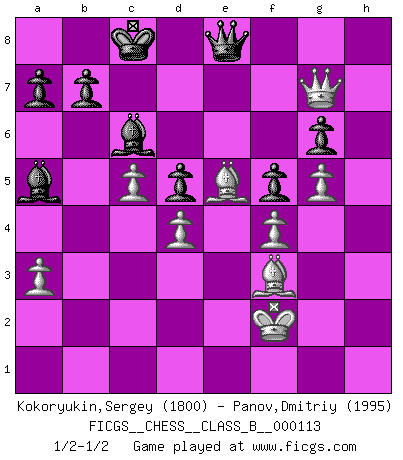 Last move : 1/2-1/2 2010 July 12 13:53:22 [Event "FICGS__CHESS__CLASS_B__000113"] [Site "FICGS"] [Date "2010.06.16"] [Round "1"] [White "Kokoryukin,Sergey"] [Black "Panov,Dmitriy"] [Result "1/2-1/2"] [WhiteElo "1800"] [BlackElo "1995"] 1.e4 e5 2.Nf3 Nf6 3.d4 Nxe4 4.Bd3 d5 5.Nxe5 Nd7 6.Nxd7 Bxd7 7.O-O Bd6 8.c4 c6 9.cxd5 cxd5 10.Nc3 Nxc3 11.bxc3 O-O 12.Qh5 f5 13.Qf3 Kh8 14.Bd2 Qa5 15.Rfb1 Bc6 16.Re1 g6 17.h4 Qd8 18.Re6 Re8 19.Rxe8+ Qxe8 20.Re1 Qf7 21.h5 Re8 22.Rxe8+ Bxe8 23.Bf4 Be7 24.Be5+ Kg8 25.hxg6 hxg6 26.g4 Bd7 27.Qh1 Kf8 28.c4 Be6 29.Qh6+ Ke8 30.c5 Bd7 31.f4 Kd8 32.Qh8+ Be8 33.Be2 Kc8 34.Bf3 Bd8 35.g5 Qe6 36.a3 Bc6 37.Kf2 Kd7 38.Qg7+ Kc8 39.Qf8 Kd7 40.Bf6 Bc7 41.Qh8 Qe8 42.Qh7+ Kc8 43.Be5 Ba5 44.Qg7 1/2-1/2 Petrov : Modern attack, Symmetrical variation Kingside Castling by player White (move 7) Kingside Castling by player Black (move 11) This chess game ended in a draw. Follow this game move after move (download)When you don't know what to do, wait for your opponent to get an idea - it's sure to be wrong. (Tarrasch) Auf jeden Fall musst du zuerst Rechtsanwalt werden, damit du deine eigenen Interessen und die deiner Familie vertreten kannst. [Brief an seinen Sohn] (José Raúl Capablanca) Si el ingenio solamente fuese necesario para lucirse, las mujeres serían las mejores jugadoras de Ajedrez del mundo. (Albin) La victoire dans une partie d'Echecs appartient la plupart du temps à celui qui voit un peu plus loin que l'adversaire. (Lasker) No, no, you're not thinking; you're just being logical. (Niels Bohr)