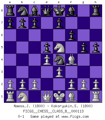 Last move : 0-1 2010 July 27 9:46:10 [Event "FICGS__CHESS__CLASS_B__000113"] [Site "FICGS"] [Date "2010.06.16"] [Round "1"] [White "Naess,Jan-Olav"] [Black "Kokoryukin,Sergey"] [Result "0-1"] [WhiteElo "1800"] [BlackElo "1800"] 1.d4 d5 2.Nf3 Nf6 3.Bg5 Ne4 4.e3 f6 5.Bf4 g5 6.Ne5 h5 0-1 This chess game has been lost on time (started : 2010.06.16 12:53:58) Torre attack (Tartakower variation) Player Black won this chess game. Follow this game move after move (download)My opponents make good moves too. Sometimes I don't take these things into consideration. (Bobby Fischer) Mit sehr nachdenklichem Gesicht schreitet Bobby durch den Turniersaal. Was ist passiert?, fragt Lombardy. Ich stehe schlecht, antwortet Fischer. Lombardy: Dann biete doch einfach Remis an. Fischer: So schlecht stehe ich nun auch wieder nicht! (Robert James Fischer) Me dio la sensación de como si yo estuviera jugando en contra del mismo Ajedrez. - al estar jugando en contra de Robert Fischer (Walter Shipman) J'apprécie les joueurs d'est-indienne, c'est grâce à eux que je nourris ma famille depuis tant d'années. (Petrosian) All battles are fought by scared men who'd rather be someplace else. (John Wayne in the movie In harm's way)