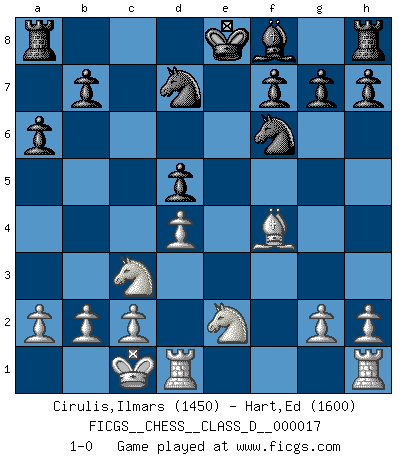 Last move : 1-0 2007 May 3 19:37:43 [Event "FICGS__CHESS__CLASS_D__000017"] [Site "FICGS"] [Date "2006.11.04"] [Round "1"] [White "Cirulis,Ilmars"] [Black "Hart,Ed"] [Result "1-0"] [WhiteElo "1450"] [BlackElo "1600"] 1.e4 e5 2.f4 exf4 3.Bc4 c6 4.Nc3 Nf6 5.d4 d5 6.exd5 cxd5 7.Bb5+ Bd7 8.Qe2+ Qe7 9.Bxf4 a6 10.Bxd7+ Nbxd7 11.O-O-O Qxe2 12.Ngxe2 1-0 KGA : Bishop's gambit, Ruy Lopez defense Queenside Castling by player White (move 11) Player White won this chess game. Follow this game move after move (download)You cannot play at Chess if you are kind-hearted. (French Proverb) Alles was ich jemals tun will ist Schach spielen. (Robert James Fischer) No es tiempo de jugar al Ajedrez cuando la casa esta en llamas. (Proverbio Italiano) L'ordinateur a tué l'originalité. Il n'y a plus guère d'aventures sur l'échiquier. (Jacob Murray) O divine art of subtlety and secrecy! Through you we learn to be invisible, through you inaudible and hence we can hold the enemy's fate in our hands. (Sun Tzu)