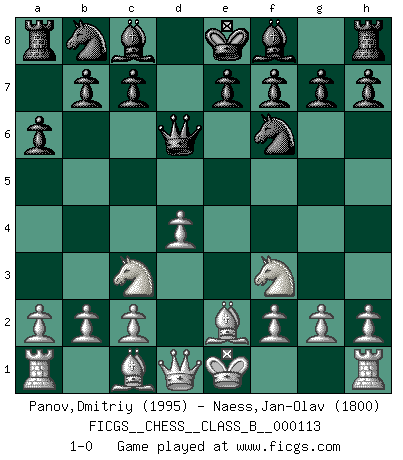 Last move : 1-0 2010 July 30 9:52:19 [Event "FICGS__CHESS__CLASS_B__000113"] [Site "FICGS"] [Date "2010.06.16"] [Round "1"] [White "Panov,Dmitriy"] [Black "Naess,Jan-Olav"] [Result "1-0"] [WhiteElo "1995"] [BlackElo "1800"] 1.e4 d5 2.exd5 Qxd5 3.Nc3 Qd6 4.d4 Nf6 5.Be2 a6 6.Nf3 1-0 This chess game has been lost on time (started : 2010.06.16 12:53:58) Scandinavian : Pytel-Wade variation Player White won this chess game. Follow this game move after move (download)Of all my Russian books, the defense contains and diffuses the greatest 'warmth' which may seem odd seeing how supremely abstract Chess is supposed to be. (Vladimir Nabokov) Die westlichen Werte sind eine Sprache, welche die Putin-Administration nicht versteht. (Garry Kasparov) Tu puedes aprender mucho mas de una partida que pierdas que de una partida ganada. Tendras que perder cientos de partidas antes de llegar a ser un buen jugador. (Jose Raul Capablanca) Les erreurs sont comme les malheurs, elles n'arrivent jamais seules. (Siegbert Tarrasch) I have opinions of my own - strong opinions - but I don't always agree with them. (George Bush)