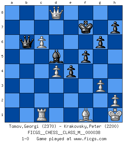 Last move : 1-0 2011 March 17 0:20:52 [Event "FICGS__CHESS__CLASS_M__000038"] [Site "FICGS"] [Date "2010.06.16"] [Round "1"] [White "Tomov,Georgi"] [Black "Krakovsky,Peter"] [Result "1-0"] [WhiteElo "2370"] [BlackElo "2200"] 1.Nf3 d5 2.d4 Nf6 3.c4 c6 4.e3 e6 5.Bd3 Nbd7 6.O-O Bd6 7.b3 e5 8.Be2 O-O 9.Bb2 e4 10.Nfd2 a6 11.Ba3 Bxa3 12.Nxa3 Re8 13.Rc1 b5 14.cxd5 Nxd5 15.Nab1 f5 16.Nc3 N5f6 17.b4 Nb6 18.Nb3 Be6 19.Na5 Rc8 20.a3 Re7 21.Re1 Rec7 22.f3 Nbd5 23.Nxd5 cxd5 24.Qd2 Ne8 25.fxe4 dxe4 26.Rc5 Qd6 27.Rec1 Nf6 28.a4 Rxc5 29.bxc5 Qc7 30.axb5 axb5 31.Bxb5 Ng4 32.g3 Nxe3 33.Qxe3 Qxa5 34.Bf1 g6 35.c6 Qb6 36.Qc3 Kf8 37.Kh1 Bd5 38.Qa3+ Kf7 39.Qd6 Rd8 40.Qxd8 1-0 This chess game has been lost on time (started : 2010.06.16 18:26:13) Reti Opening Kingside Castling by player White (move 6) Kingside Castling by player Black (move 8) Player White won this chess game. Follow this game move after move (download)Pawns: they are the soul of this game, they alone form the attack and defense. (Philidor) Glücklicherweise sind Großmeister Ruben Fines reine Schachbücher weniger phallozentrisch [als seine Schachpsychologie] und deswegen auch weniger lächerlich. (Nigel Short) Si yo gano un torneo, yo lo gano por mí mismo. Yo hago las jugadas. Nadie me ayuda. (Bobby Fischer) Seul un grand joueur sait à quel point il joue faiblement. (Xavier Tartacover) Never was anything great achieved without danger. (Niccolo Machiavelli)