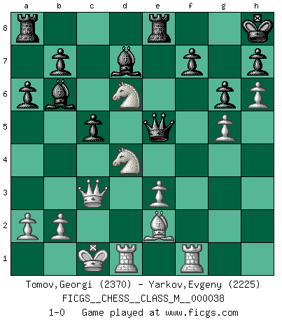 Last move : 1-0 2011 January 5 22:33:31 [Event "FICGS__CHESS__CLASS_M__000038"] [Site "FICGS"] [Date "2010.06.16"] [Round "1"] [White "Tomov,Georgi"] [Black "Yarkov,Evgeny"] [Result "1-0"] [WhiteElo "2370"] [BlackElo "2225"] 1.d4 d5 2.c4 c6 3.e3 Nf6 4.Nc3 e6 5.Nf3 Nbd7 6.Qc2 Bd6 7.g4 dxc4 8.Bxc4 e5 9.g5 Nd5 10.Ne4 Bc7 11.Bd2 exd4 12.Nxd4 Ne5 13.Be2 O-O 14.h4 Bb6 15.O-O-O Qe7 16.Rhg1 Re8 17.h5 a6 18.Bc3 Kh8 19.h6 g6 20.f4 Bd7 21.fxe5 Nxc3 22.Qxc3 Qxe5 23.Rgf1 c5 24.Nd6 1-0 This chess game has been lost on time (started : 2010.06.16 18:26:13) QGD Slav defense Kingside Castling by player Black (move 13) Queenside Castling by player White (move 15) Player White won this chess game. Follow this game move after move (download)No Chess Grandmaster is normal; they only differ in the extent of their madness. (Viktor Korchnoi) Ja, jede Frau in Holland liebt mich bestimmt, und alle Männer hassen mich. (Loek van Wely) El Ajedrez es realmente noventa y nueve por ciento calculación. (Soltis) Je fais ceci parce que dans cinquante coups j'obtiendrai cela; je m'appelle Mikhail Moisevitch Botvinnik. (Botvinnik) Programming can only do so much before it becomes too much. (Don Groves)