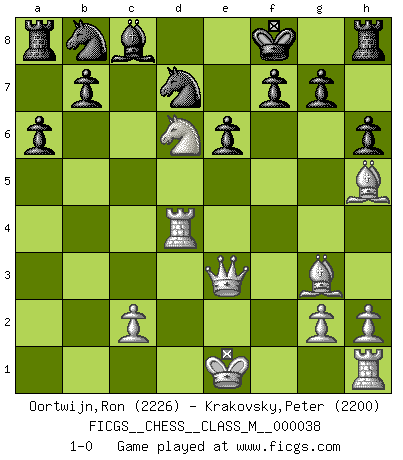 Last move : 1-0 2010 September 3 22:25:58 [Event "FICGS__CHESS__CLASS_M__000038"] [Site "FICGS"] [Date "2010.06.16"] [Round "1"] [White "Oortwijn,Ron"] [Black "Krakovsky,Peter"] [Result "1-0"] [WhiteElo "2226"] [BlackElo "2200"] 1.e4 c5 2.Nf3 d6 3.d4 cxd4 4.Nxd4 Nf6 5.Nc3 a6 6.Bg5 e6 7.f4 Qb6 8.Qd2 Qxb2 9.Rb1 Qa3 10.e5 dxe5 11.fxe5 Nfd7 12.Ne4 h6 13.Bh4 Qxa2 14.Rd1 Qd5 15.Qe3 Qxe5 16.Be2 Bc5 17.Bg3 Bxd4 18.Rxd4 Qh5 19.Nd6+ Kf8 20.Bxh5 1-0 Sicilian : Najdorf, 7...Qb6 Player White won this chess game. Follow this game move after move (download)I give 98 percent of my mental energy to Chess. Others give only 2 percent. (Bobby Fischer) Fischer machte Schach einfach zu einer aufregenden Sache, wann immer er sich ans Brett setzte. (Raymond Keene) Todos los Maestros de Ajedrez fueron un día unos principiantes. (Chernev) Je ne suis pas le dernier à jouer lâchement des coups douteux pendant le zeïtnot de l'adversaire pour l'achever: en effet les coups qui font le plus peur sont ceux que l'on ne comprend pas. Je me fais souvent peur quand je joue. (Un professeur anonyme) Thibault, I ask for draw. Game 13876. - Sorry Ilmars, you won. (FICGS chat)
