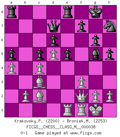 Last move : 0-1 2010 October 15 23:25:28 [Event "FICGS__CHESS__CLASS_M__000038"] [Site "FICGS"] [Date "2010.06.16"] [Round "1"] [White "Krakovsky,Peter"] [Black "Broniek,Mariusz Maciej"] [Result "0-1"] [WhiteElo "2200"] [BlackElo "2253"] 1.e4 c5 2.Nf3 d6 3.d4 cxd4 4.Nxd4 Nf6 5.Nc3 a6 6.Be3 e5 7.Nb3 Be6 8.f3 h5 9.Qd2 Nbd7 10.Nd5 Bxd5 11.exd5 Qc7 12.c4 a5 13.a4 b6 14.Bd3 Nc5 15.Nxc5 bxc5 16.O-O Be7 17.Rae1 O-O 18.Bc2 Rfe8 19.Qe2 g6 20.Bd2 Nh7 21.Qf2 Bg5 22.Bc3 Qd7 0-1 Sicilian : Najdorf, Byrne (English) attack Kingside Castling by player White (move 16) Kingside Castling by player Black (move 17) Player Black won this chess game. Follow this game move after move (download)Fischer was a master of clarity and a king of artful positioning. His opponents would see where he was going but were powerless to stop him. (Bruce Pandolfini) Frage des Reporters: -Welche besonderen Umstände rechtfertigen das Anhalten der Uhren während einer Turnierpartie? Antwort: -Einen Fotographen zu strangulieren. (Siegbert Tarrasch) La captura del Rey enemigo es la finalidad pero no el primer objetivo de la partida. (William Steinitz) Comme les marins qui ont mille raisons différentes d'aller en mer, les joueurs d'échecs en ont tout autant avant de s'installer devant une table et jouer... (Vincent Bertignac, philosophe) I take risks, sometimes patients die, but not taking risks causes more patients to die. So I guess my biggest problem is I've been cursed with the ability to do the math. (Gregory House, House M.D.)