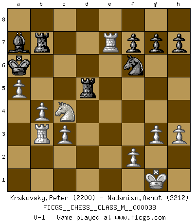Last move : 0-1 2010 October 15 23:25:34 [Event "FICGS__CHESS__CLASS_M__000038"] [Site "FICGS"] [Date "2010.06.16"] [Round "1"] [White "Krakovsky,Peter"] [Black "Nadanian,Ashot"] [Result "0-1"] [WhiteElo "2200"] [BlackElo "2212"] 1.e4 d5 2.exd5 Qxd5 3.d4 Nc6 4.Nf3 Bg4 5.Be2 O-O-O 6.Be3 Nf6 7.Nbd2 Qf5 8.O-O e5 9.Nxe5 Bxe2 10.Qxe2 Nxe5 11.dxe5 Qxe5 12.Nc4 Qe6 13.Rfe1 Ng4 14.Bxa7 Qxe2 15.Rxe2 b6 16.a4 Kb7 17.h3 Nf6 18.a5 Ra8 19.Bxb6 cxb6 20.Nxb6 Rd8 21.Nc4 Bc5 22.b4 Bd4 23.Ra3 Ka6 24.c3 Ba7 25.Rb3 Rd5 26.Re7 Rb8 27.g3 Rb7 0-1 Scandinavian (centre counter) defense Queenside Castling by player Black (move 5) Kingside Castling by player White (move 8) Player Black won this chess game. Follow this game move after move (download)You are for me the Queen on d8 and I am the Pawn on d7 !! (Eduard Gufeld) Schach ist die gewalttätigste aller Sportarten. (Garry Kasparov) Aún el Rey más flojo huye despavorido ante la amenaza de un Jaque doble. (Aaron Nimzowitsch) Karpov est une pièce de musée. (Garry Kasparov) This is where the fun begins. (Anakin Skywalker in Star Wars ep.3)