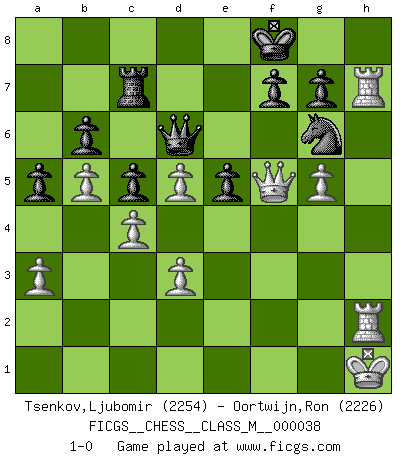 Last move : 1-0 2010 July 5 22:47:10 [Event "FICGS__CHESS__CLASS_M__000038"] [Site "FICGS"] [Date "2010.06.16"] [Round "1"] [White "Tsenkov,Ljubomir"] [Black "Oortwijn,Ron"] [Result "1-0"] [WhiteElo "2254"] [BlackElo "2226"] 1.c4 e5 2.Nc3 Nf6 3.Nf3 Nc6 4.g3 Bc5 5.Nxe5 Bxf2+ 6.Kxf2 Nxe5 7.e4 c5 8.d3 d6 9.Kg2 O-O 10.Be2 Qd7 11.h3 Qe6 12.Be3 Bd7 13.Qd2 a6 14.Raf1 h6 15.Rf2 Rae8 16.b4 b6 17.a3 a5 18.b5 Ng6 19.g4 Rb8 20.Rhf1 Nh7 21.Nd5 Bc8 22.h4 Bb7 23.Rh1 Ne5 24.Kg1 Bxd5 25.exd5 Qe7 26.g5 Rfe8 27.Bf4 hxg5 28.hxg5 Nf8 29.Qe3 Qd7 30.Qg3 Nfg6 31.Bd2 Rb7 32.Bh5 Kf8 33.Bxg6 Nxg6 34.Bc3 Rc7 35.Rh7 Re5 36.Bxe5 dxe5 37.Qf3 Kg8 38.Rfh2 Qd6 39.Qh3 Kf8 40.Kh1 Qd7 41.Qf3 Qd6 42.Qf5 1-0 English Opening Kingside Castling by player Black (move 9) Player White won this chess game. Follow this game move after move (download)The game of chess is the touchstone of the intellect. (Goethe) Es war undenkbar für die Behörden, dass ein sowjetischer Großmeister auf diese Art und Weise [Fischer-Taimanov 6:0] verliert, ohne dass es eine politischer Erklärung dafür gäbe. (Mark Taimanov) A la fecha, Fischer esta simplemente un nivel arriba de todos los mejores jugadores de Ajedrez del mundo. (John Jacobs) Avec des compensations pour le matériel en plus... (Anonyme) Control your own destiny or someone else will. (Jack Welch)