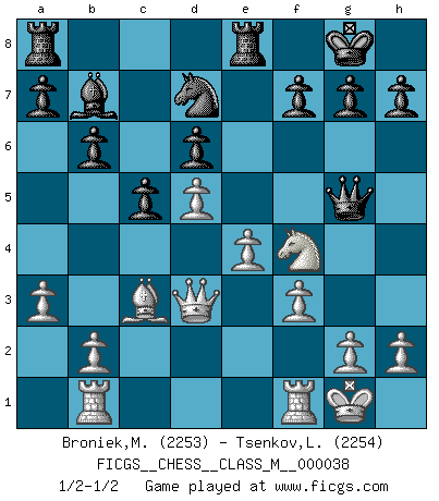 Last move : 1/2-1/2 2010 July 9 21:3:32 [Event "FICGS__CHESS__CLASS_M__000038"] [Site "FICGS"] [Date "2010.06.16"] [Round "1"] [White "Broniek,Mariusz Maciej"] [Black "Tsenkov,Ljubomir"] [Result "1/2-1/2"] [WhiteElo "2253"] [BlackElo "2254"] 1.d4 Nf6 2.c4 e6 3.Nc3 Bb4 4.e3 b6 5.Nge2 c5 6.a3 Ba5 7.Bd2 O-O 8.d5 exd5 9.cxd5 Bb7 10.Nf4 d6 11.Bd3 Nbd7 12.Rb1 Bxc3 13.Bxc3 Ne5 14.O-O Nxd3 15.Qxd3 Re8 16.f3 Nd7 17.e4 Qg5 1/2-1/2 Nimzo-Indian : Fischer variation Kingside Castling by player Black (move 7) Kingside Castling by player White (move 14) This chess game ended in a draw. Follow this game move after move (download)I look one move ahead... the best ! (Siegbert Tarrasch) Alles was ich jemals tun will ist Schach spielen. (Robert James Fischer) El Ajedrez es un terrible juego. Si no controlas el centro, tu oponente tiene una posición mas holgada. Si tienes control del centro, ¡entonces realmente tu tienes algo de que preocuparte!. (Siegbert Tarrasch) Aidez vos pièces, elles vous aideront. (Paul Morphy) Sometimes it pays to stay in bed in Monday, rather than spending the rest of the week debugging Monday's code. (Dan Salomon)