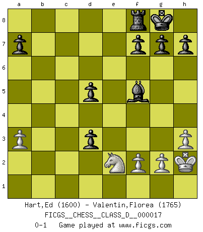 Last move : 0-1 2006 December 6 16:21:58 [Event "FICGS__CHESS__CLASS_D__000017"] [Site "FICGS"] [Date "2006.11.04"] [Round "1"] [White "Hart,Ed"] [Black "Valentin,Florea"] [Result "0-1"] [WhiteElo "1600"] [BlackElo "1765"] 1.e4 c5 2.Nf3 Nc6 3.d4 cxd4 4.Nxd4 Nf6 5.Nc3 e5 6.Nxc6 bxc6 7.a3 Be7 8.Bg5 O-O 9.Qf3 Rb8 10.b3 d5 11.Bxf6 Bxf6 12.Bd3 Qa5 13.b4 Rxb4 14.O-O Rb6 15.Ne2 Be6 16.exd5 cxd5 17.Bf5 e4 18.Qh3 Bxf5 19.Qg3 Bxa1 20.Rxa1 Qd2 21.Qe3 Qxc2 22.h3 Rb1+ 23.Rxb1 Qxb1+ 24.Kh2 Qd3 25.Qxd3 exd3 0-1 Sicilian : Pelikan (Lasker/Sveshnikov) variation Kingside Castling by player Black (move 8) Kingside Castling by player White (move 14) Player Black won this chess game. Follow this game move after move (download)There are two types of sacrifices: correct ones and mine. (Mikhail Tal) Gegen einen Schachcomputer zu verlieren ist wie Löcher in den Strümpfen zuhaben. Es ist nicht peinlich, solange man der einzige ist der es weiß. (Anonymous) Aquel que teme a un Peón de Reina aislado, debería de retirarse del Ajedrez. (Siegbert Tarrasch) 'L'échange des dames est un coup dur pour les deux adversaires...' Un journaliste lors d'une partie du match Spassky-Fischer Coffee just isn't my cup of tea. (Unknown)