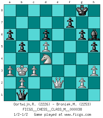 Last move : 1/2-1/2 2010 November 6 19:48:54 [Event "FICGS__CHESS__CLASS_M__000038"] [Site "FICGS"] [Date "2010.06.16"] [Round "1"] [White "Oortwijn,Ron"] [Black "Broniek,Mariusz Maciej"] [Result "1/2-1/2"] [WhiteElo "2226"] [BlackElo "2253"] 1.e4 c5 2.Nf3 d6 3.d4 cxd4 4.Nxd4 Nf6 5.Nc3 a6 6.Be3 e5 7.Nb3 Be6 8.f3 h5 9.Nd5 Nxd5 10.exd5 Bf5 11.Bd3 Bxd3 12.Qxd3 Be7 13.O-O-O Nd7 14.Kb1 Rc8 15.Rhe1 O-O 16.f4 Re8 17.c3 b5 18.Nd2 Nf6 19.Rf1 exf4 20.Rxf4 Ng4 21.Bd4 Bg5 22.R4f1 Ne3 23.Bxe3 Bxe3 24.Nf3 Rc7 25.Rde1 Rce7 26.Re2 Qd7 27.Rfe1 Bf4 28.Rxe7 Rxe7 29.Rxe7 Qxe7 30.h3 g6 31.Kc2 Be3 32.a3 Bh6 33.Nd4 Qg5 34.Qf3 Qc1+ 35.Kb3 Qb1 36.Qe2 1/2-1/2 Sicilian : Najdorf, Byrne (English) attack Queenside Castling by player White (move 13) Kingside Castling by player Black (move 15) This chess game ended in a draw. Follow this game move after move (download)Chess is really ninety nine percent calculation. (Soltis) Gott hat gewollt, dass ich Champion werde. (Surab Azmajparaschvili) ¿Que sería del Ajedrez sin errores graciosos?. (Kurt Richter) Le moment que je préfère le plus dans une rencontre, c'est celui où je sens que la personnalité de l'adversaire se brise. (Robert Fischer) If passion drives you, let reason holds the reins. (Benjamin Franklin)