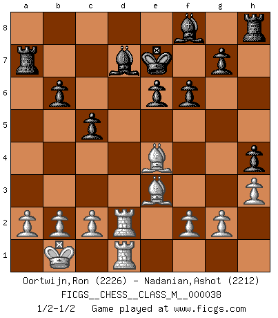 Last move : 1/2-1/2 2010 July 23 4:38:10 [Event "FICGS__CHESS__CLASS_M__000038"] [Site "FICGS"] [Date "2010.06.16"] [Round "1"] [White "Oortwijn,Ron"] [Black "Nadanian,Ashot"] [Result "1/2-1/2"] [WhiteElo "2226"] [BlackElo "2212"] 1.e4 d5 2.exd5 Qxd5 3.Nc3 Qd6 4.d4 Nf6 5.Nf3 c6 6.Ne5 Nbd7 7.Nc4 Qc7 8.Qf3 Nb6 9.Bf4 Qd7 10.Nxb6 axb6 11.O-O-O Qg4 12.Qe3 Qf5 13.d5 e6 14.dxc6 bxc6 15.Qf3 Bd7 16.Bb5 Rc8 17.Bd3 Qg4 18.Qxg4 Nxg4 19.Bg3 Ra8 20.Kb1 h5 21.h3 Nf6 22.Ne4 Nxe4 23.Bxe4 h4 24.Be5 f6 25.Bd4 Ra6 26.Rd2 Ke7 27.Re1 c5 28.Be3 Ra7 29.Red1 1/2-1/2 Scandinavian : Pytel-Wade variation Queenside Castling by player White (move 11) This chess game ended in a draw. Follow this game move after move (download)Capture of the adverse King is the ultimate but not the first object of the game. (William Steinitz) Schach ist ein schwarz-weisser Dschungel. (Garry Kasparov) Yo he agregado estos principios a la ley: pongan los Caballos en acción antes de que los dos Alfiles sean desarrollados. (Emanuel Lasker) RxDa4 pat (...) Every vice is only an exaggeration of a necessary and virtuous function. (Ralph Waldo Emerson, Journals 1936)