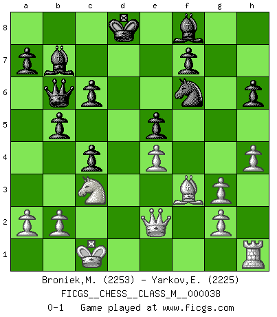 Last move : 0-1 2010 December 8 7:43:19 [Event "FICGS__CHESS__CLASS_M__000038"] [Site "FICGS"] [Date "2010.06.16"] [Round "1"] [White "Broniek,Mariusz Maciej"] [Black "Yarkov,Evgeny"] [Result "0-1"] [WhiteElo "2253"] [BlackElo "2225"] 1.d4 d5 2.c4 c6 3.Nf3 Nf6 4.Nc3 e6 5.Bg5 h6 6.Bh4 dxc4 7.e4 g5 8.Bg3 b5 9.Be2 Bb7 10.h4 g4 11.Ne5 Nbd7 12.Bxg4 Rg8 13.Nxd7 Qxd7 14.Bf3 O-O-O 15.Qd2 Rxg3 16.fxg3 e5 17.O-O-O Qxd4 18.Qe2 Qb6 19.Rxd8+ Kxd8 0-1 QGD Slav : 4.Nc3 Queenside Castling by player Black (move 14) Queenside Castling by player White (move 17) Player Black won this chess game. Follow this game move after move (download)If your opponent cannot do anything active, then don't rush the position; instead you should let him sit there, suffer, and beg you for a draw. (Jeremy Silman) Ich bin der einzige Schachspieler, der sich während der Vorbereitungen zum Turnier verletzt hat. (Woody Allen) Cuando veas una buena jugada, trata de encontrar otra mejor. (Emanuel Lasker) Karpov est une pièce de musée. (Garry Kasparov) When the going gets tactical, the computers get going. (Hyatt)
