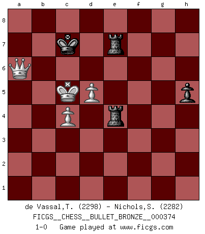 Last move : 1-0 2010 June 16 19:59:4 [Event "FICGS__CHESS__BULLET_BRONZE__000374"] [Site "FICGS"] [Date "2010.06.16"] [Round "1"] [White "de Vassal,Thibault"] [Black "Nichols,Scott"] [Result "1-0"] [WhiteElo "2298"] [BlackElo "2282"] 1.d4 d5 2.Nf3 Nf6 3.c4 c6 4.Nc3 e6 5.e3 Nbd7 6.Qc2 Bd6 7.g4 Nxg4 8.Rg1 Nxh2 9.Nxh2 Bxh2 10.Rxg7 Nf8 11.Rg2 Bc7 12.e4 Ng6 13.Bg5 f6 14.Bh6 dxe4 15.O-O-O f5 16.Kb1 Qe7 17.Be2 Bd7 18.d5 Be5 19.d6 Qf7 20.Qa4 Bxc3 21.bxc3 f4 22.Bh5 e3 23.Kb2 c5 24.Qc2 O-O-O 25.Rg5 e5 26.Rxe5 Qxc4 27.Be2 Qa4 28.Rxc5+ Kb8 29.Qb1 Rc8 30.Rd4 Rxc5 31.Rxa4 Bxa4 32.fxe3 f3 33.Bf1 Rd8 34.Qd3 Rc6 35.Qf5 Rcxd6 36.Qxf3 R6d7 37.e4 Re8 38.Bc4 Ne5 39.Bf4 Kc8 40.Bxe5 Rxe5 41.Bd5 Rde7 42.c4 Bc6 43.Qf8+ Kc7 44.Kb3 h5 45.Qf6 Be8 46.Kb4 Kc8 47.a4 Kc7 48.a5 Bd7 49.Kb3 Be8 50.Kc3 Ba4 51.Qf2 Kb8 52.a6 Bc6 53.Qf8+ Kc7 54.Qa8 Bxd5 55.exd5 bxa6 56.Qxa7+ Kd8 57.Qa8+ Kc7 58.Qxa6 Re3+ 59.Kd4 R3e4+ 60.Kc5 1-0 Queen's pawn game Queenside Castling by player White (move 15) Queenside Castling by player Black (move 24) 10 pieces endgame at move 55 : White KQPP , Black KRRPPP WHITE : King + 1 Queen 2 Pawns BLACK : King + 2 Rooks 3 Pawns 9 pieces endgame at move 56 : White KQPP , Black KRRPP WHITE : King + 1 Queen 2 Pawns BLACK : King + 2 Rooks 2 Pawns 8 pieces endgame at move 58 : White KQPP , Black KRRP WHITE : King + 1 Queen 2 Pawns BLACK : King + 2 Rooks 1 Pawn Player White won this chess game. Follow this game move after move (download)I have always a slight feeling of pity for the man who has no knowledge of Chess. (Siegbert Tarrasch) Dass jemand wie Surab Asmaiparaschwili, der selbst Elopunkte gekauft hat , Vize-Präsident der Fide werden konnte, sagt schon einges über den Zustand dieser Organisation aus. (Joel Lautier) Uno no tiene que jugar muy bien, es suficiente jugar mejor que el oponente. (Siegbert Tarrasch) Psychologiquement, tu dois avoir confiance en toi même, mais cette confiance doit être basée sur des faits. (Robert Fischer) Do you know these so called Volunteers don't even get paid! (Simpsons)