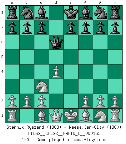Last move : 1-0 2010 July 22 9:40:4 [Event "FICGS__CHESS__RAPID_B__000152"] [Site "FICGS"] [Date "2010.06.17"] [Round "1"] [White "Sternik,Ryszard"] [Black "Naess,Jan-Olav"] [Result "1-0"] [WhiteElo "1803"] [BlackElo "1800"] 1.e4 d5 2.exd5 Qxd5 3.Nc3 Qd6 4.d4 1-0 This chess game has been lost on time (started : 2010.06.17 10:26:57) Scandinavian : Pytel-Wade variation Player White won this chess game. Follow this game move after move (download)There just isn't enough televised Chess. (David Letterman) Über Karpov: Er war und ist ein Vertreter der russischen Reaktionäre. Das steckt tief in seiner Seele, wehalb ich nicht nett mit ihm umgehen kann. (Viktor Kortschnoi) El Ajedrez no es como la vida... ¡tiene reglas!. (Mark Pasternak) C'est une question de caractère, Beaucoup de gens perdent leur motivation très vite. D'autres, ils sont rares, peuvent la conserver très longtemps. J'aime les échecs, encore aujourd'hui je suis heureux d'analyser des parties. J'aime toujours gagner, je déteste encore perdre. Bien jouer est important pour mon intégrité intellectuelle et morale. Et puis les échecs vivent en ce moment une période historique grâce à Internet. Ils se développent dans les systèmes éducatifs à travers le monde. Ils sortent de leur ghetto, et c'est mon rôle de mener à bien cette révolution. (Gary Kasparov) Once you start thinking you have nothing left to learn, you have everything to learn. (Steve Badget)