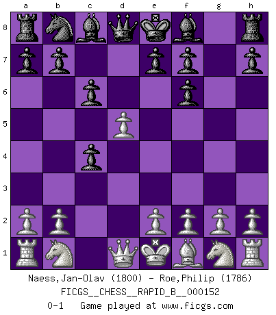 Last move : 0-1 2010 August 1 21:58:22 [Event "FICGS__CHESS__RAPID_B__000152"] [Site "FICGS"] [Date "2010.06.17"] [Round "1"] [White "Naess,Jan-Olav"] [Black "Roe,Philip"] [Result "0-1"] [WhiteElo "1800"] [BlackElo "1786"] 1.d4 Nf6 2.Bg5 d5 3.Bxf6 gxf6 4.c4 dxc4 5.d5 c6 0-1 This chess game has been lost on time (started : 2010.06.17 10:26:57) Trompowsky attack (Ruth, Opovcensky Opening) Player Black won this chess game. Follow this game move after move (download)The enormous mental resilience, without which no Chess player can exist, was so much taken up by Chess that he could never free his mind of this game. (Albert Einstein) Sie bekommen vielleicht den Eindruck, dass die Spitzenspieler überhaupt gar nicht so stark sind. Aber das stimmt nicht. Es ist eine Illusion. Mit einem Computer an der Seite ist es sehr leicht, Urteile zu fällen, aber wenn man alleine am Brett sitzt, sieht die Sache ganz anders aus. (Vladimir Kramnik) Bobby Fischer es el jugador de Ajedrez mas grande que jamás haya existido. (Ken Smith) Votre seul travail dans les ouvertures est d'obtenir un milieu de partie jouable. (Lajos Portish) Creativity involves breaking out of established patterns in order to look at things in a different way. (Edward De Bono)