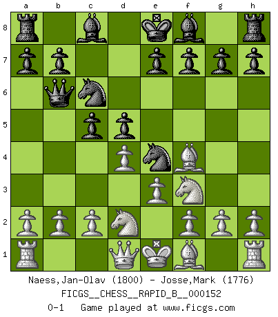 Last move : 0-1 2010 July 25 21:44:44 [Event "FICGS__CHESS__RAPID_B__000152"] [Site "FICGS"] [Date "2010.06.17"] [Round "1"] [White "Naess,Jan-Olav"] [Black "Josse,Mark"] [Result "0-1"] [WhiteElo "1800"] [BlackElo "1776"] 1.d4 d5 2.Nf3 Nf6 3.Bg5 Ne4 4.Bf4 c5 5.Nbd2 Nc6 6.e3 Qb6 0-1 This chess game has been lost on time (started : 2010.06.17 10:26:57) Torre attack (Tartakower variation) Player Black won this chess game. Follow this game move after move (download)I'm not a materialistic person, in that, I don't suffer the lack or loss of money. The absence of worldly goods I don't look back on. For Chess is a way I can be as materialistic as I want without having to sell my soul. (Jamie Walter Adams) Schach ist mein Leben, meine Leidenschaft, was ich gelernt habe und seit meinem 14. Lebensjahr profimässig praktiziere. Darauf zu verzichten, würde mir sehr schwer fallen. (Viktor Kortschnoi) El juego de Damas es para vagabundos. (Paul Morphy) Les échecs c'est le défi de l'alpiniste, toujours plus haut, prêt à tout pour monter à l'assaut du Roi ennemi. Les échecs, c'est de la musique en mouvement, un ballet majestueux pour les yeux. C'est de la poésie composée par les fantômes du passé qui au même titre que Rimbaud ou Verlaine méritent notre admiration. Les échecs, c'est de la peinture ou le moindre mouvement modifie le tableau pour en faire un Picasso ou un Van Gogh. Les échecs, c'est tout et rien, c'est la vie et la mort. Jjulie33 sur le forum de France-Echecs. All politicians must be presumed guilty until they are proven innocent. (Dinesh De Silva)