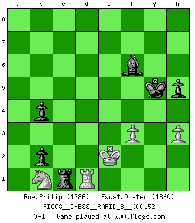 Last move : 0-1 2010 October 31 1:32:56 [Event "FICGS__CHESS__RAPID_B__000152"] [Site "FICGS"] [Date "2010.06.17"] [Round "1"] [White "Roe,Philip"] [Black "Faust,Dieter"] [Result "0-1"] [WhiteElo "1786"] [BlackElo "1860"] 1.e4 c5 2.Nf3 d6 3.Bb5+ Bd7 4.Bxd7+ Nxd7 5.O-O Ngf6 6.Qe2 g6 7.c3 Bg7 8.d4 e6 9.Rd1 cxd4 10.cxd4 d5 11.e5 Ne4 12.Nbd2 Nxd2 13.Bxd2 O-O 14.Bb4 Re8 15.Qd2 f6 16.exf6 Nxf6 17.Rac1 Qb6 18.Bc5 Ne4 19.Bxb6 Nxd2 20.Rxd2 axb6 21.Ra1 b5 22.g4 Rf8 23.Kg2 Rf4 24.h3 h5 25.Kg3 Re4 26.Rc1 Bh6 27.g5 Bf8 28.Rdc2 Bd6+ 29.Kg2 Kf7 30.Rc8 Rxc8 31.Rxc8 Re2 32.Rd8 Ke7 33.Rh8 Rxb2 34.Rh7+ Ke8 35.Rg7 b4 36.Rxg6 Rxa2 37.Rxe6+ Kd7 38.Re3 Ra3 39.Re1 b3 40.Rb1 Bb4 41.Ng1 Bd2 42.g6 Ke7 43.Ne2 Kf6 44.Rb2 Bh6 45.Nc3 Bc1 46.Nxd5+ Kxg6 47.Re2 Ra6 48.Re7 b6 49.Nc3 b2 50.d5 b5 51.d6 Rxd6 52.Re4 Rd3 53.Nb1 Bg5 54.Re1 Bf6 55.f3 b4 56.Kf2 Rc3 57.Ke2 Rc1 58.Rd1 Kg5 0-1 Sicilian : Canal-Sokolsky attack, 3...Bd7 Kingside Castling by player White (move 5) Kingside Castling by player Black (move 13) Player Black won this chess game. Follow this game move after move (download)A thorough understanding of the typical mating continuations makes the most complicated sacrificial combinations leading up to them not only not difficult, but almost a matter of course. (Siegbert Tarrasch) Ein Großmeister muß tausende Partien in seinem Kopf speichern, denn diese sind für Ihn, was die Worte der Muttersprache für gewöhnliche Leute sind, oder Noten für Musiker... (Garry Kasparov) Debes de llevar a tu oponente hacia un profundo y obscuro bosque donde 2+2=5, y el camino que conduce a la salida es suficientemente ancho para solamente uno. (Mikhail Tal) Donnez-moi un Cavalier en 6e et je gagnerais toutes mes parties. (Steinitz) Always be a first-rate version of yourself, instead of a second-rate version of somebody else. (Judy Garland)